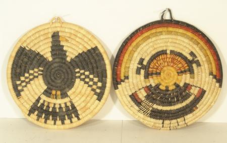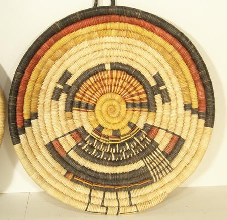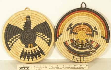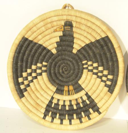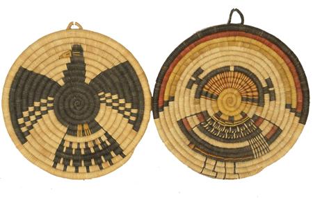 Set of beautiful finely woven 3rd Mesa mealing trays, one with Hopi maiden, the other a black eagle. Purchased in 1970 for $180; appraisal value $1,300. 10" each