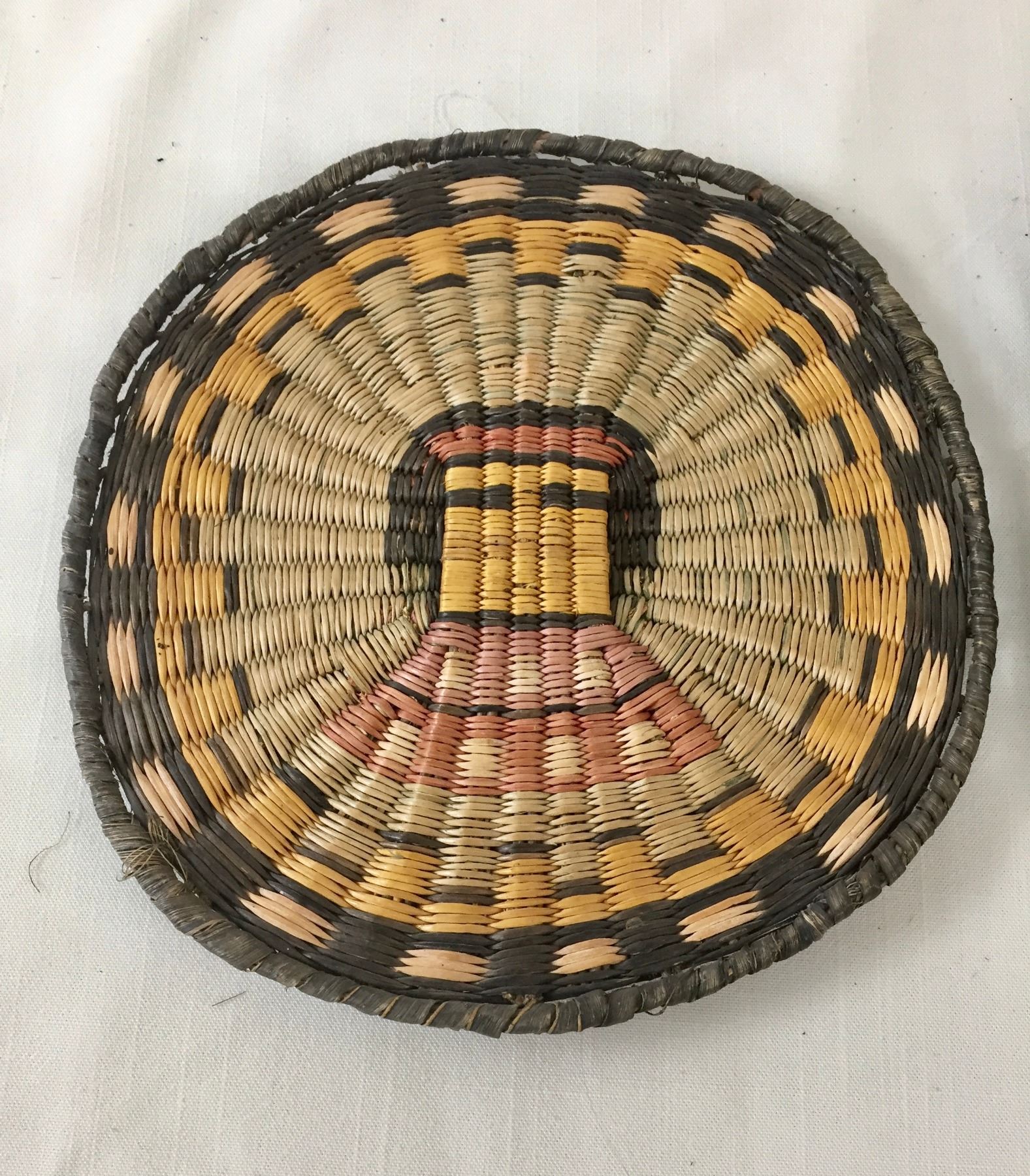 Description: Offered for sale in this lot are two, nice, Hopi wicker baskets featuring multiple colors in the designs. Maker: Unknown Hopi artists. Approx. Age: Vintage. Size: 8” round and 13” round. Condition: Pretty good for their ages, normal wear expected. Please look closely at the pictures - they are an important part of our description. Shipping: There will be a $7 handling / packaging fee for shipping this lot. The actual cost of postage will be added on top of that.