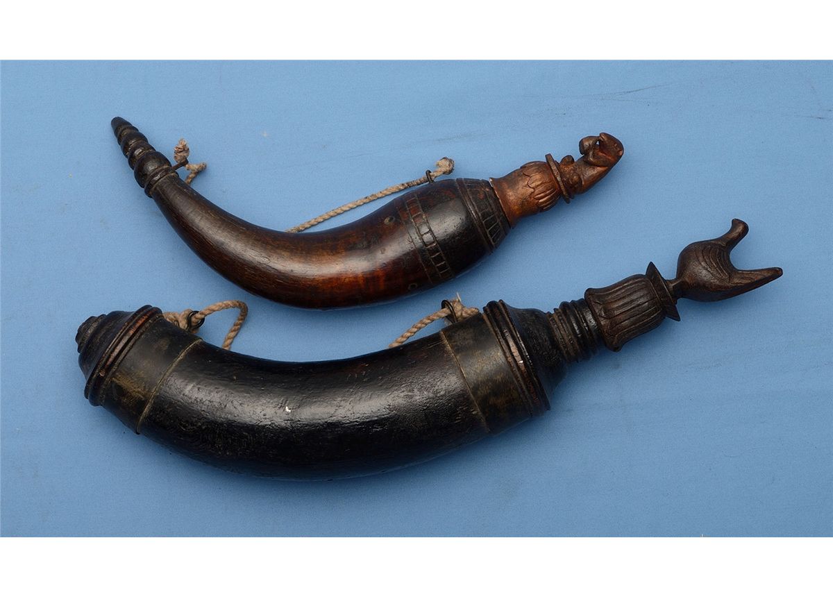 1) 11 1/2 inches overall, with a cord hanger and a carved wood plug. 2) 15 1/2 inches long, with a cord hanger secured to brass collars, and a carved hardwood plug. CONDITION: Fair to good overall.