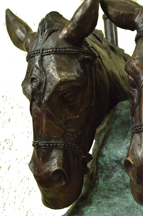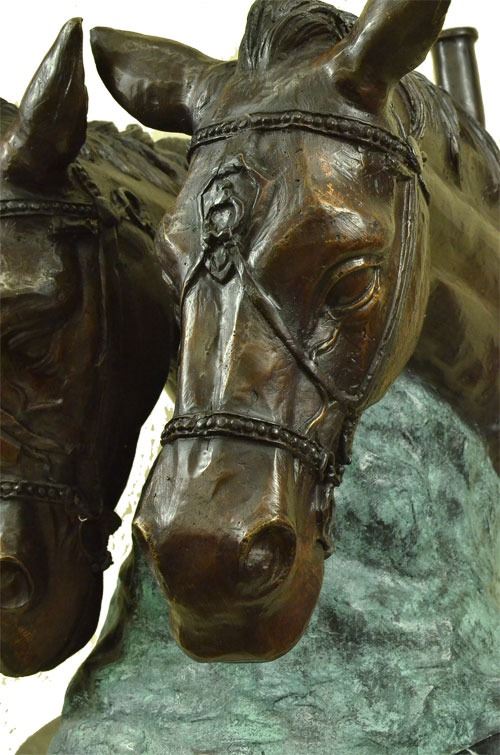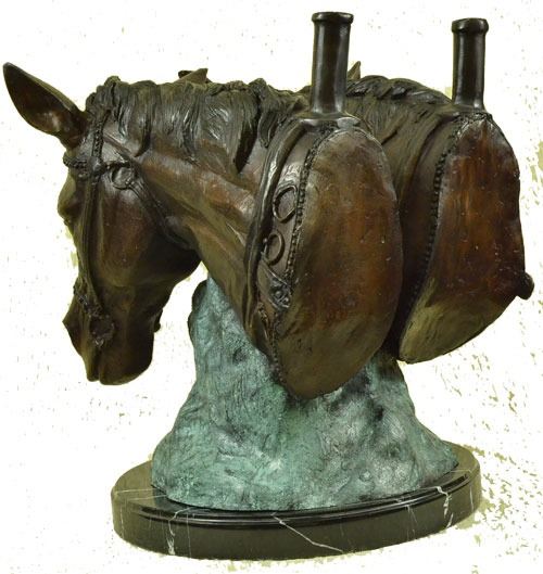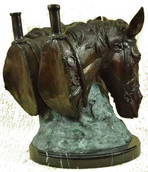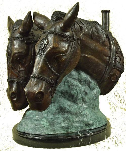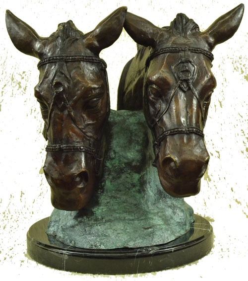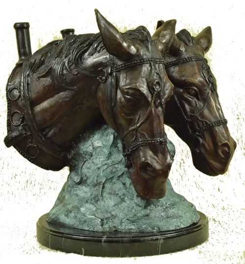 This gorgeous bronze bust of two horses is unique and filled with a raging vibe of energy. The horses are seems to be excited or spooked. This sculpture is beautifully detailed and is sure to look great on any mantle,shelf,or table. This sculpture is 100% bronze and is handmade. This sculpture was cast using the Lost Wax Method and it is mounted on a marble base. Bronze Dimensions with Marble Base: Height 19 X Width 17 inches. Weight: 70 LBS. Inventory: 32-9450040023