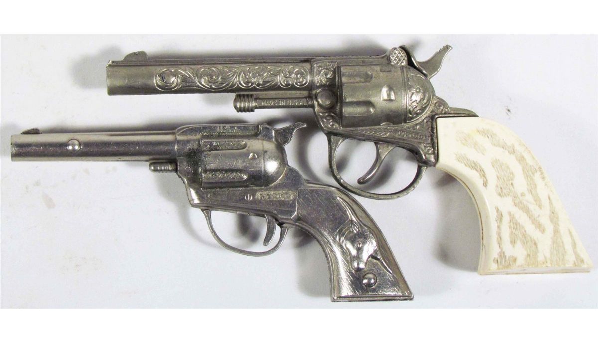 Two Hubley Die Cast Toy Cap Guns including Tex all metal and plastic grips with 2 7/8 inch barrel. Overall good condition.