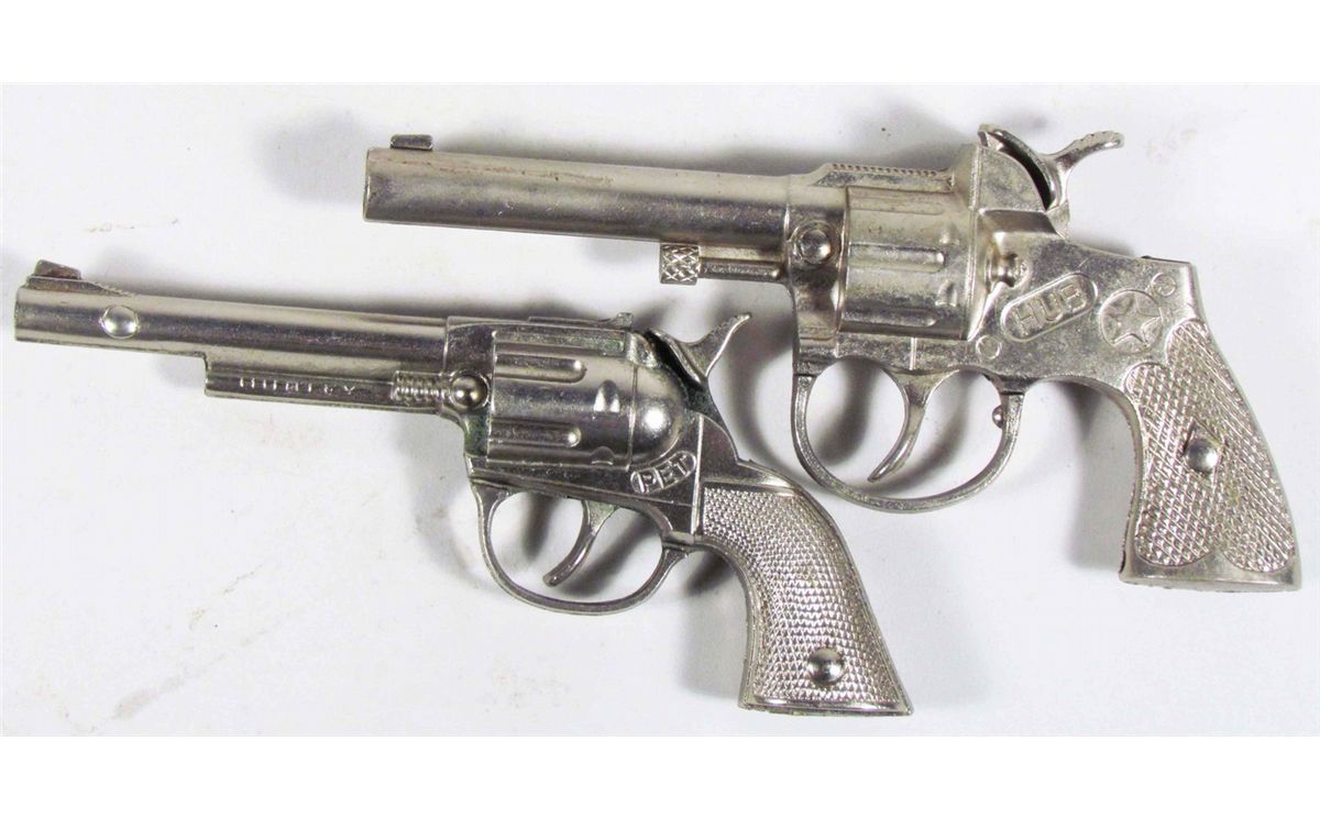 Two Hubley Die Cast Toy Cap Guns including "Pet" and "Hub" both metal with 2 3/4 inch barrels. Very good condition.