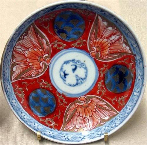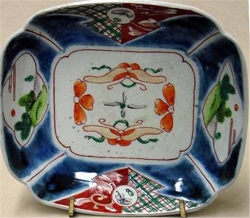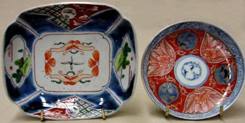 Two Imari bowls; the first in rectangular form with polychrome decorations in reserves and center with butterfly design; measures 1 1/2" high x 6 1/4" x 5 1/4"; the second round bowl with stylized reserves; measures 1" high x 5" diameter; both mid to late 19th C. (no visible defects)