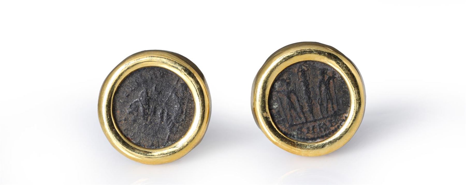 Two Imperial Roman coins mounted in 18k yellow gold as earrings; gross weight 14.6 g, each D 3/4" (approx.)