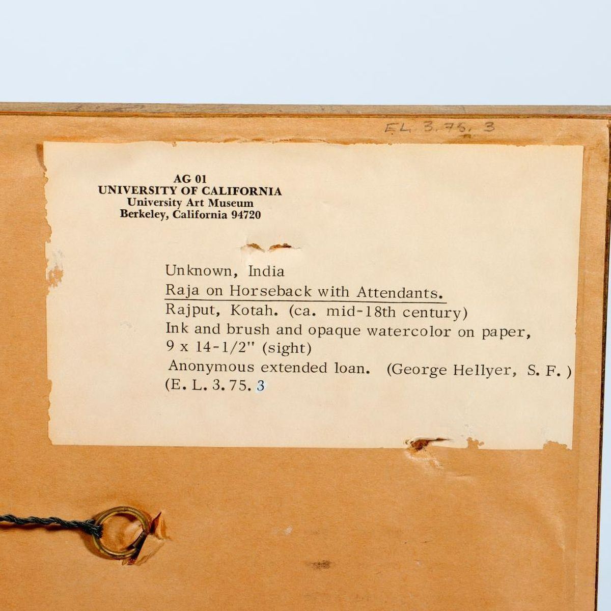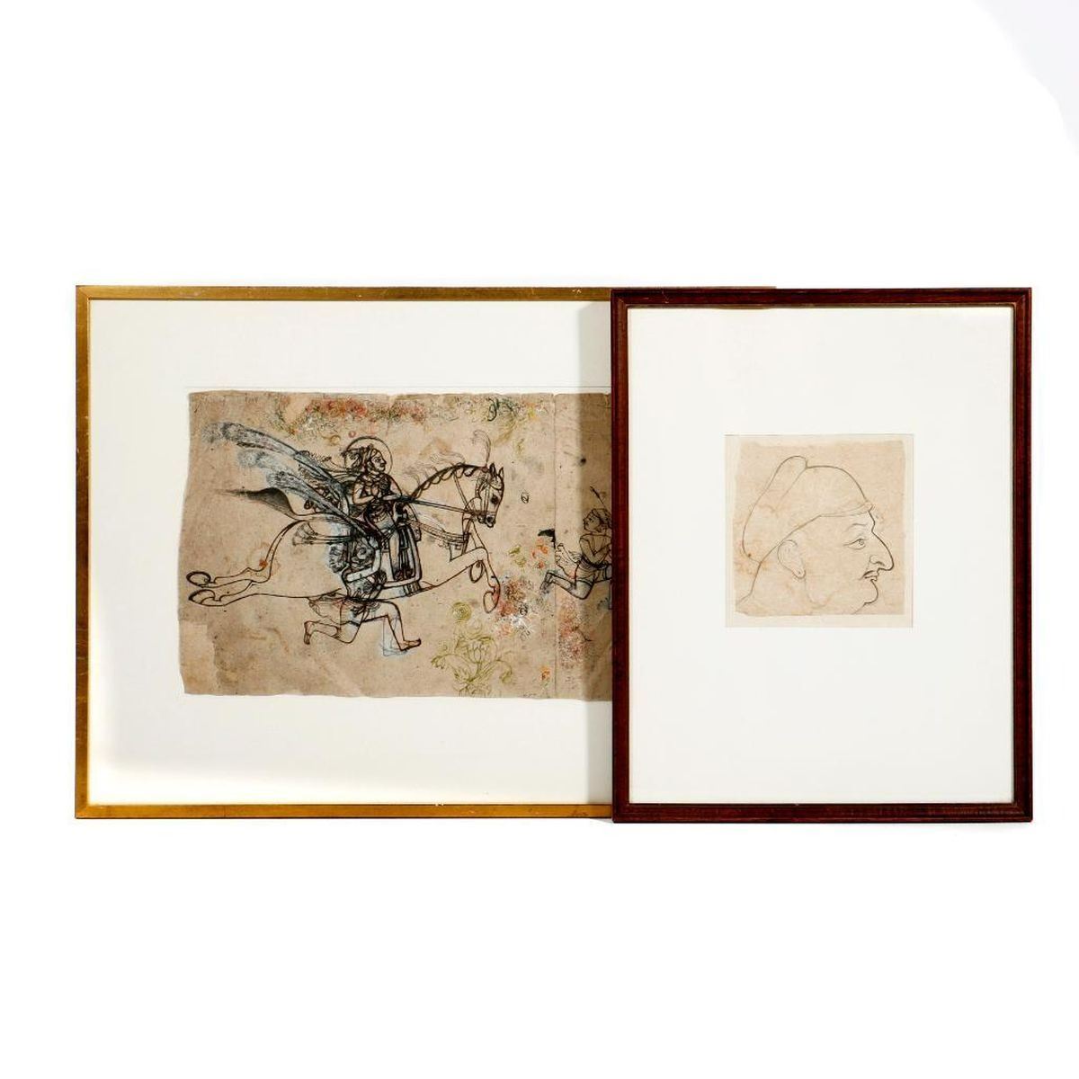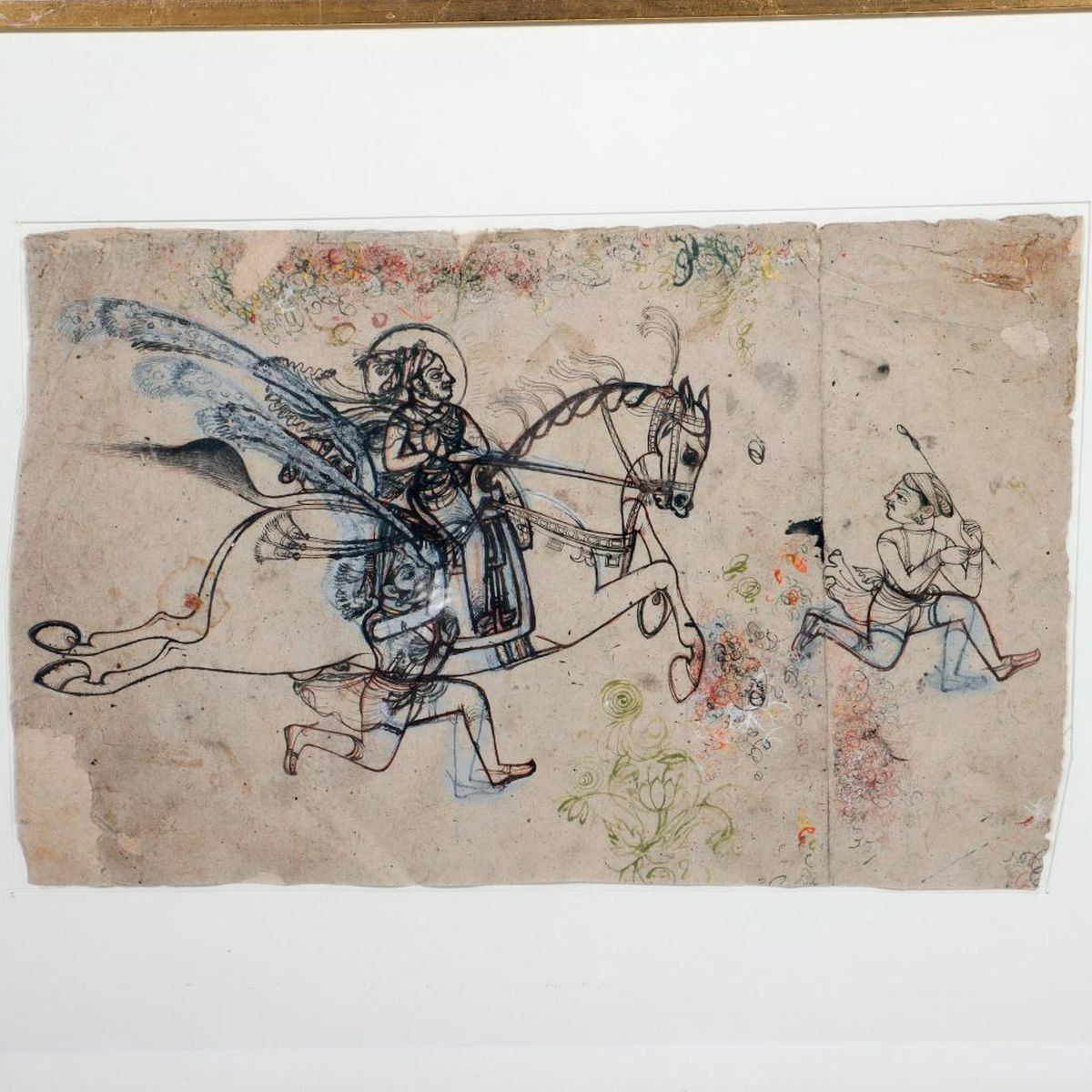 Artist: Unknown. Title/Subject: Raja on Horseback with Attendants; and, Profile portrait of a man (two works). Size: Raja, 9in x 14in 1/2in (sight); 15 1/2in x 20 1/2in (frame). Portrait, 5in x 5in (sight); 15 1/2 Year Created: The first (Raja) with a label identifying the work as mid-18th century. The portrait c. 19th century. Medium/Ground: Ink and wash; both laid down on paper. Condition: Both with dampstaining; the larger work with edge tears/losses and creases. Condition Report: All lots are sold as is and where is. Turner Auctions + Appraisals, LLC provides condition reports upon request to aid in your bidding decision. No statement regarding age, condition, kind, value, or quality of a lot, whether made orally at the auction or at any other time, or in writing in this catalog or elsewhere, shall be construed to be an express or implied warranty, representation, or assumption of liability. All sales are final, Turner Auctions + Appraisals, LLC does not give refunds based on condition. Turner Auctions + Appraisals, LLC does not perform any shipping or packing services. We do have a list of suggested shippers who gladly provide quotes prior to your bidding. Please visit our webpage for a list of recommended shippers.