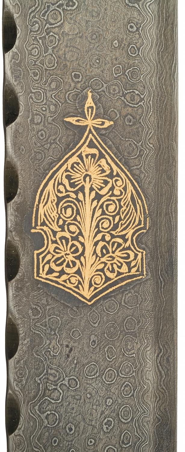 Condition: 1) Good, with a strong Damascus pattern, 60% of the original blue showing a brown patina, and excellent gold inlay. A small crack is visible on the hilt. 2) Very good, with excellent Damascus pattern, strong gold inlay and a brown patina on the hilt. Felt and leather show minor handling marks.