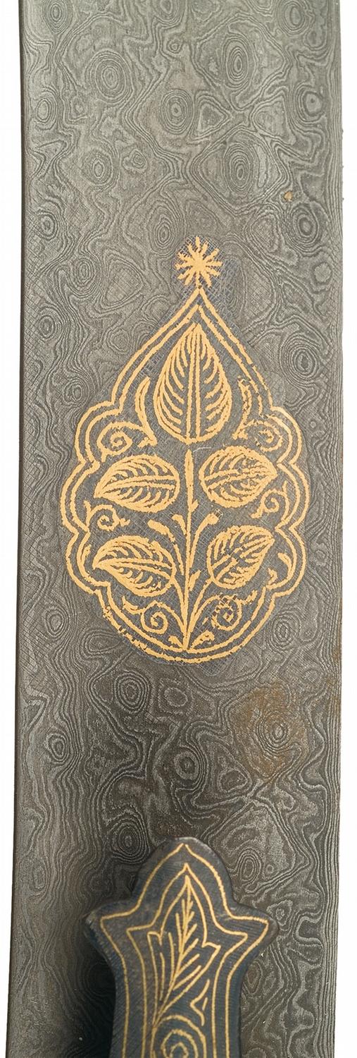 1) Saber, 32" single edged Damascus pattern curved blade, with gold inlaid leaf designs in blue finished panels on either side. Blue steel hilt with red filler material, extensive gold scroll and leaf inlay, palmswell grip, curved knuckle bow and large pommel disc. With sheath, decorated in fine multicolored floral upholstery with gold wire mesh along the seam. 2) Khanda sword, 32" blade with square tip, 9" false edge, filework on the spine and a gold inlaid floral pattern on the right side of the blade. Metal hilt with red filler material, gold leaf pattern inlay on the languets, floral inlay on the crossguard, wide knuckleguard, and pommel, green felt grip and interior lining, and round pommel cup with spike. With a black leather sheath.