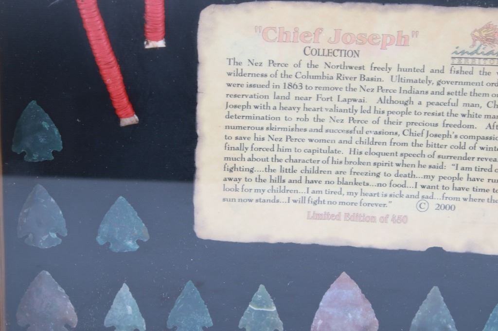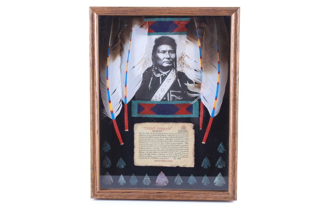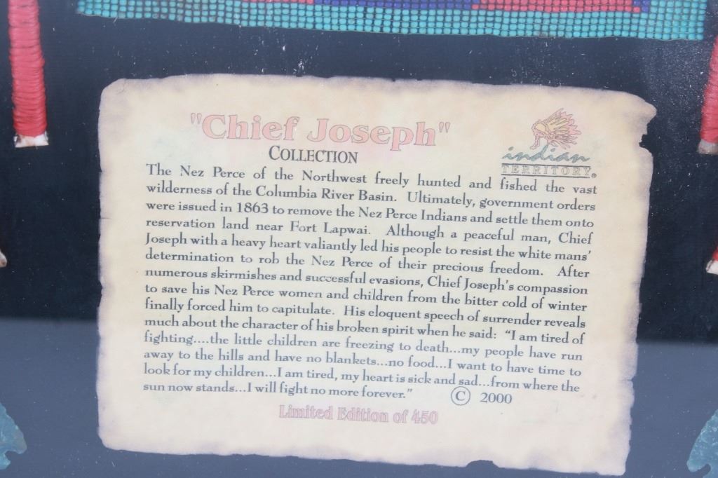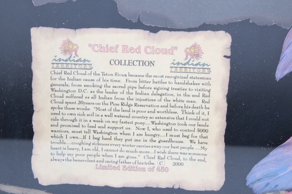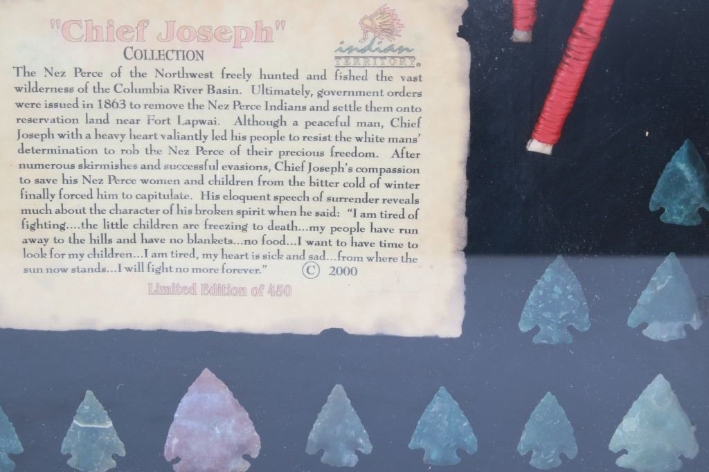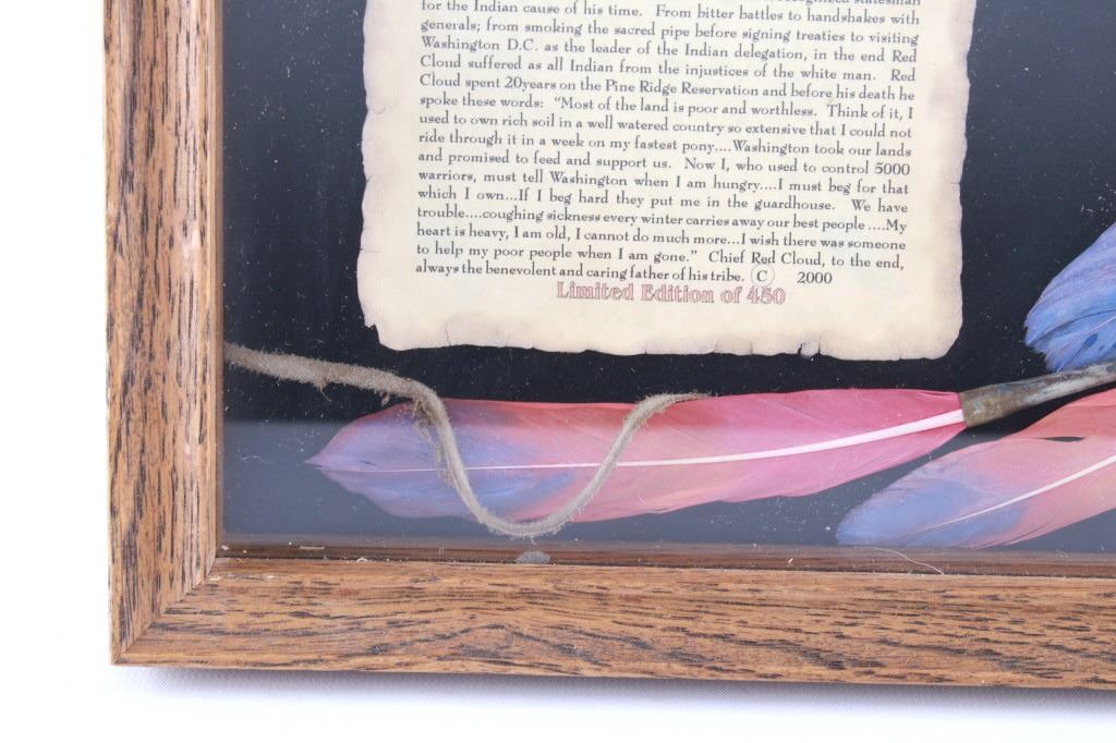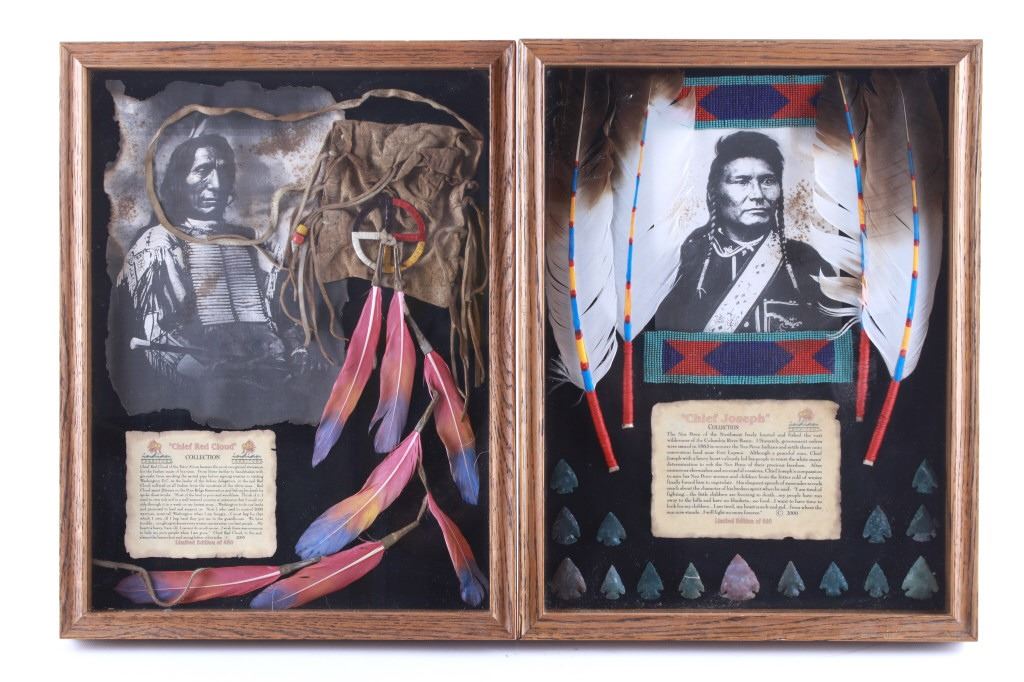 For your consideration are these two wood framed shadow box style, limited edition Native American art from Indian Territory made in 2000. The first is the Chief Red Cloud collection numbered 43 out of 450. The box contains a Native American dream catcher with multi-colored feathers attached to a rawhide bag. It features colors of red, blue, yellow, black, white and purple. Also inside the box is a black and white photo of Chief Red Cloud with a small historic write-up about him. The back of the shadow box features the Certificate of Authenticity from Indian Territory stating that this is a limited edition numbered 43 out of 450. The second in this collection is the Chief Joseph collection numbered 72 out of 450. This collection features twine wrapped and painted feathers with colors of blue, red, and yellow, a black and white photo of Chief Joseph, two beaded flat rectangles with colored beads of red, dark blue and light blue in a geometric pattern and 15 small arrow heads. Above the arrow heads is a small historic write up on Chief Joseph and his war to resist the white man. The back of the shadow box features the Certificate of Authenticity and is numbered 72 out of 450 showing that it is a limited edition piece. Both shadow box frames are in good condition with no signs of obvious damage to the shadow box frame or the art pieces inside. The shadow boxes measure 17" L x 12 7/8" W x 1 7/16" D.