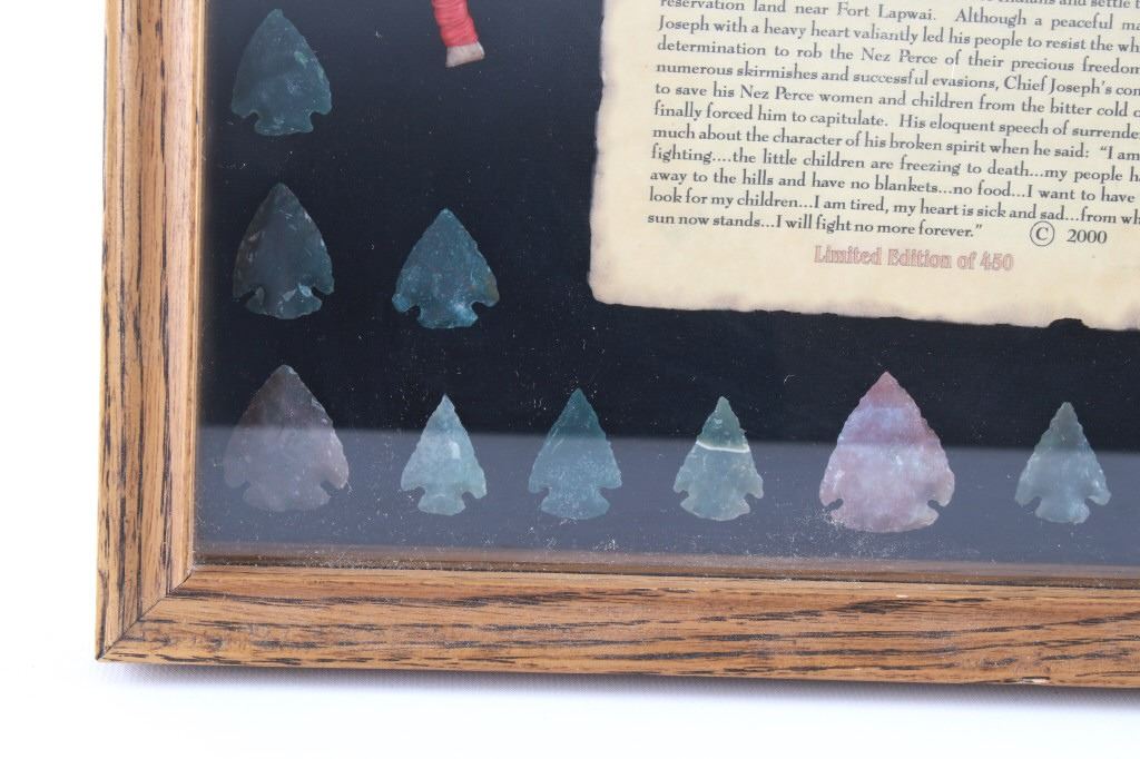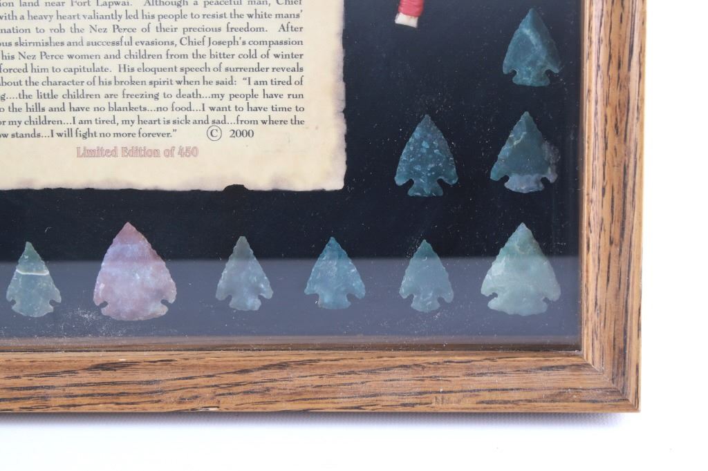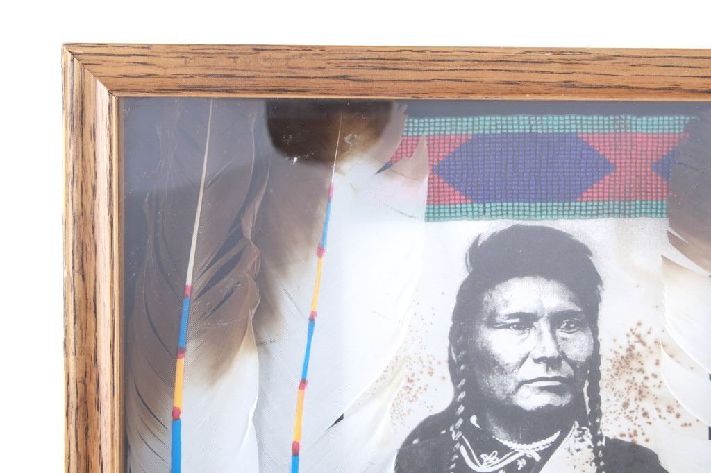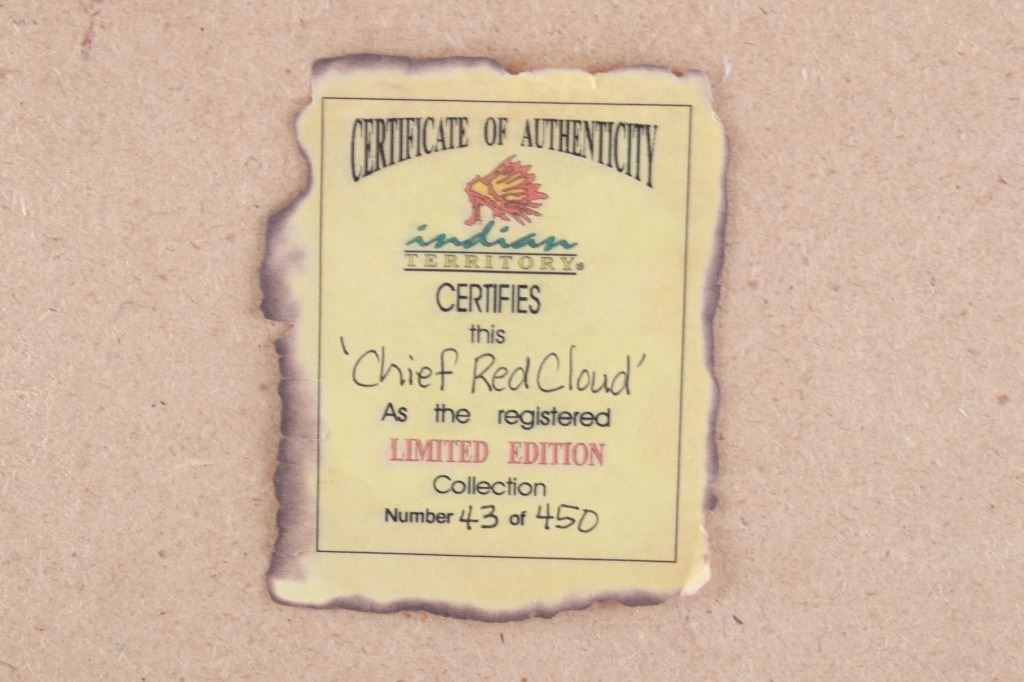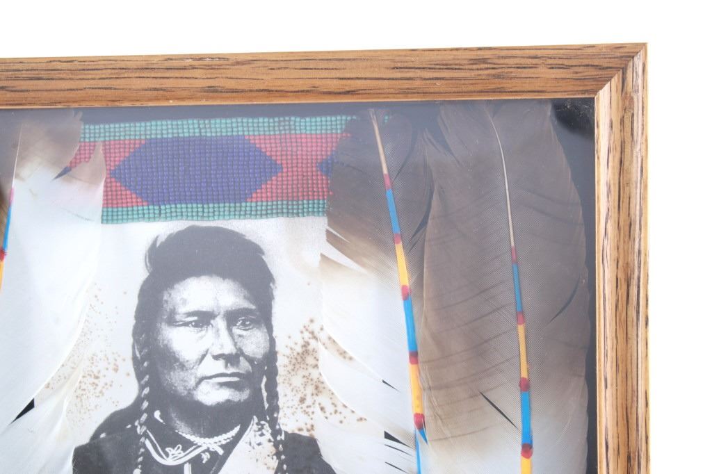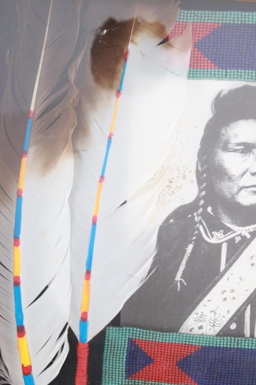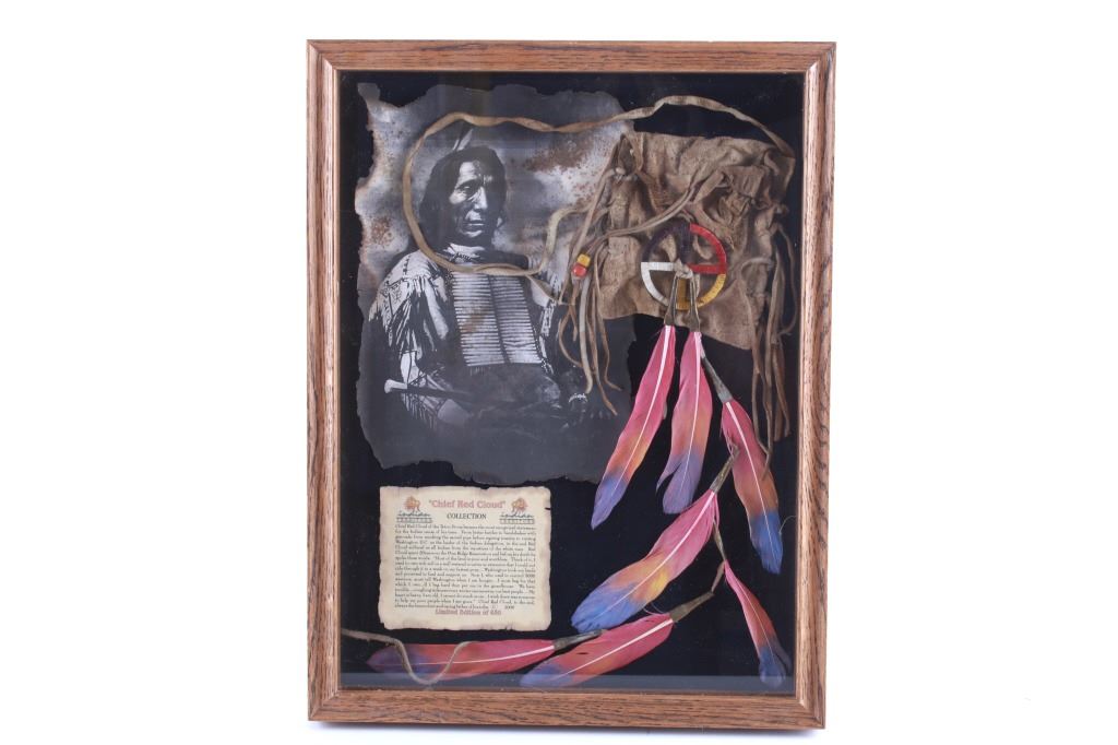 For your consideration are these two wood framed shadow box style, limited edition Native American art from Indian Territory made in 2000. The first is the Chief Red Cloud collection numbered 43 out of 450. The box contains a Native American dream catcher with multi-colored feathers attached to a rawhide bag. It features colors of red, blue, yellow, black, white and purple. Also inside the box is a black and white photo of Chief Red Cloud with a small historic write-up about him. The back of the shadow box features the Certificate of Authenticity from Indian Territory stating that this is a limited edition numbered 43 out of 450. The second in this collection is the Chief Joseph collection numbered 72 out of 450. This collection features twine wrapped and painted feathers with colors of blue, red, and yellow, a black and white photo of Chief Joseph, two beaded flat rectangles with colored beads of red, dark blue and light blue in a geometric pattern and 15 small arrow heads. Above the arrow heads is a small historic write up on Chief Joseph and his war to resist the white man. The back of the shadow box features the Certificate of Authenticity and is numbered 72 out of 450 showing that it is a limited edition piece. Both shadow box frames are in good condition with no signs of obvious damage to the shadow box frame or the art pieces inside. The shadow boxes measure 17" L x 12 7/8" W x 1 7/16" D.