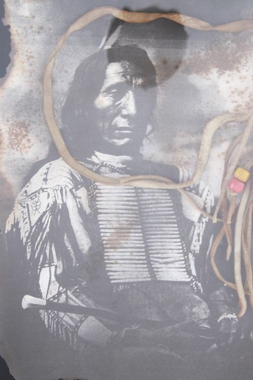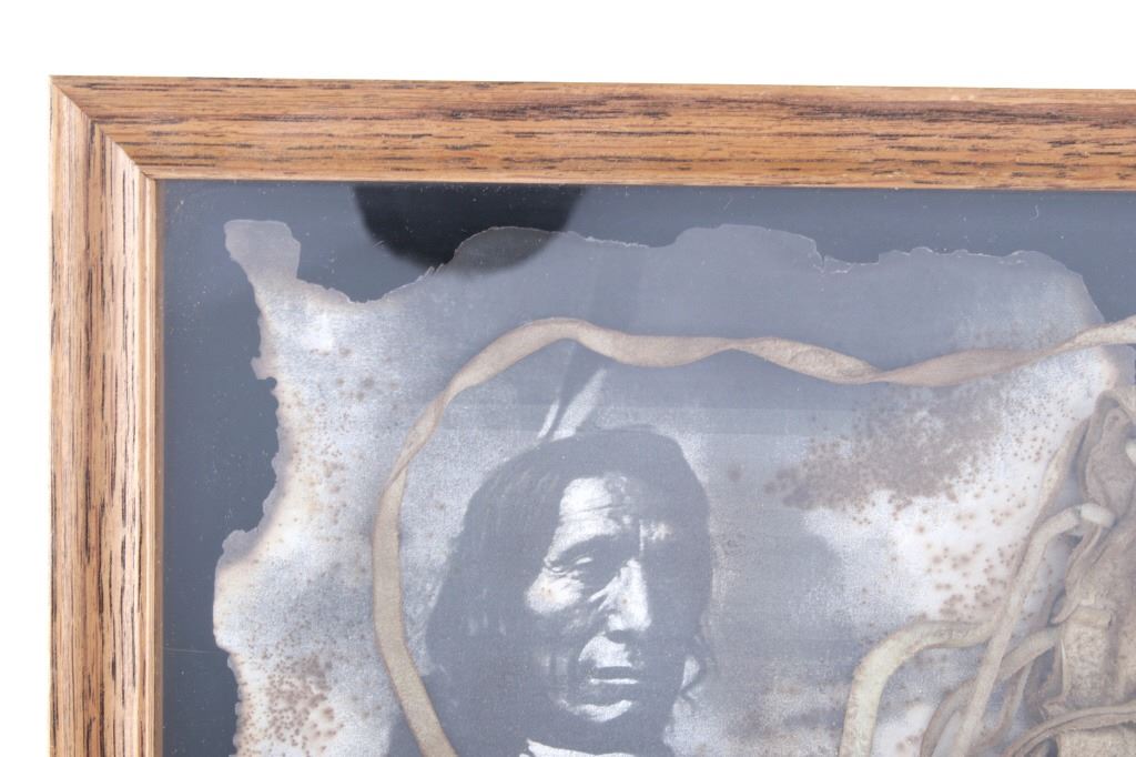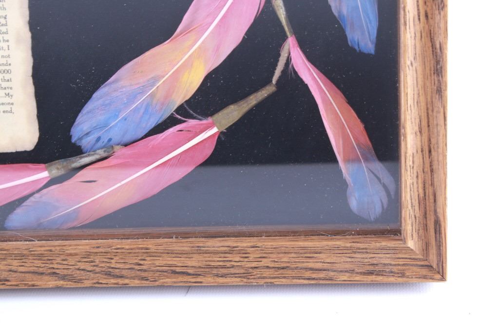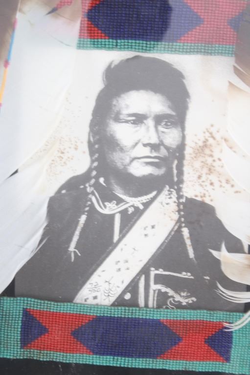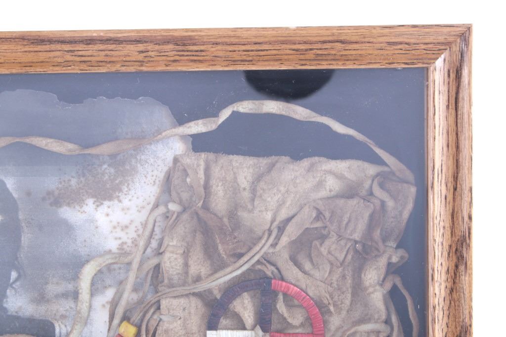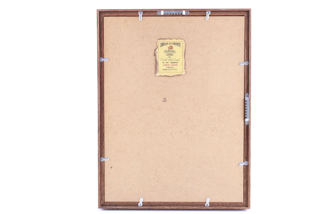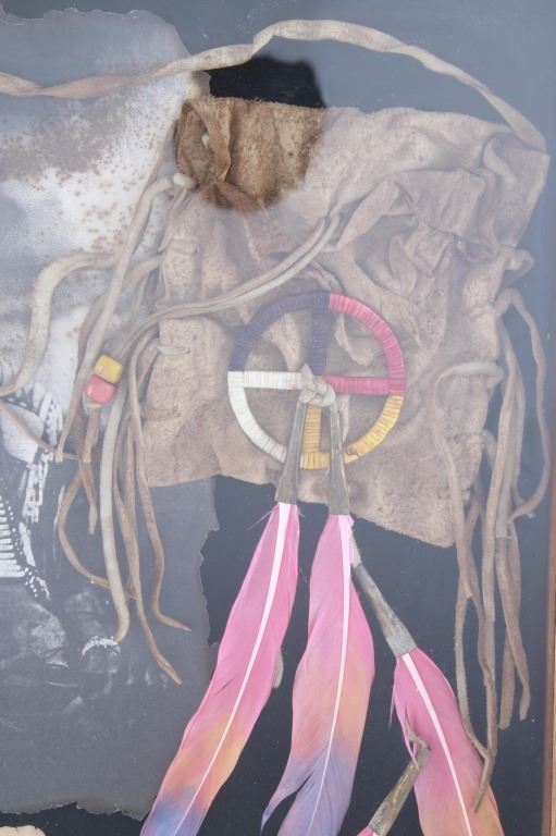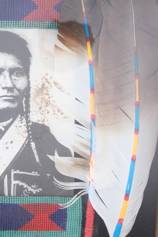 For your consideration are these two wood framed shadow box style, limited edition Native American art from Indian Territory made in 2000. The first is the Chief Red Cloud collection numbered 43 out of 450. The box contains a Native American dream catcher with multi-colored feathers attached to a rawhide bag. It features colors of red, blue, yellow, black, white and purple. Also inside the box is a black and white photo of Chief Red Cloud with a small historic write-up about him. The back of the shadow box features the Certificate of Authenticity from Indian Territory stating that this is a limited edition numbered 43 out of 450. The second in this collection is the Chief Joseph collection numbered 72 out of 450. This collection features twine wrapped and painted feathers with colors of blue, red, and yellow, a black and white photo of Chief Joseph, two beaded flat rectangles with colored beads of red, dark blue and light blue in a geometric pattern and 15 small arrow heads. Above the arrow heads is a small historic write up on Chief Joseph and his war to resist the white man. The back of the shadow box features the Certificate of Authenticity and is numbered 72 out of 450 showing that it is a limited edition piece. Both shadow box frames are in good condition with no signs of obvious damage to the shadow box frame or the art pieces inside. The shadow boxes measure 17" L x 12 7/8" W x 1 7/16" D.