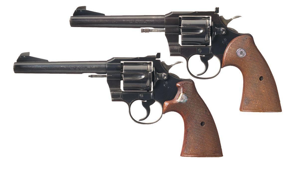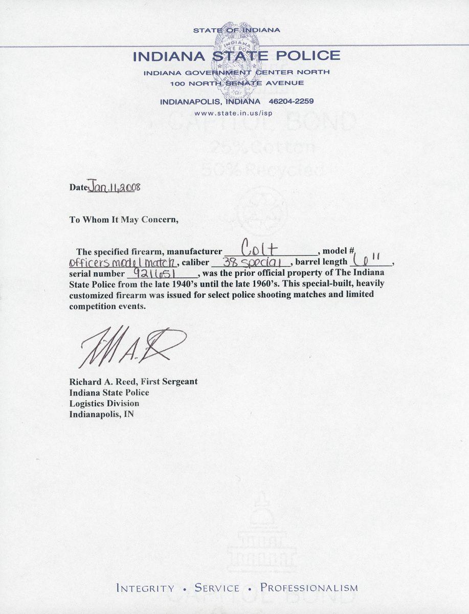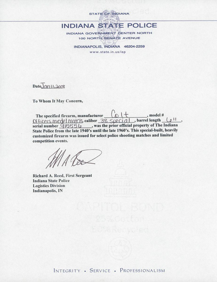 A) Donated to the Indiana State Police by the Ford Dealers of Indiana in 1957, and engraved as such on the right side. Adjustable sights, checkered wide hammer, serrated trigger and a set of checkered factory target grips with medallions. With confirming letter from the Indiana State Police.