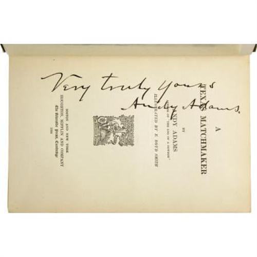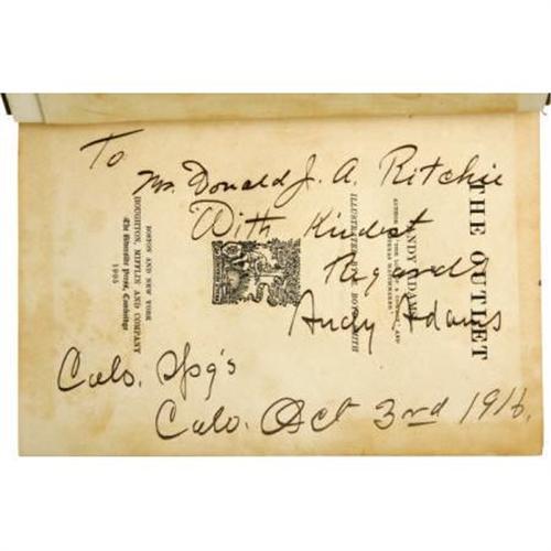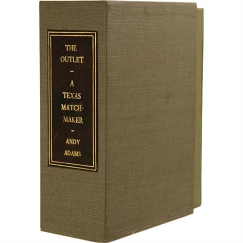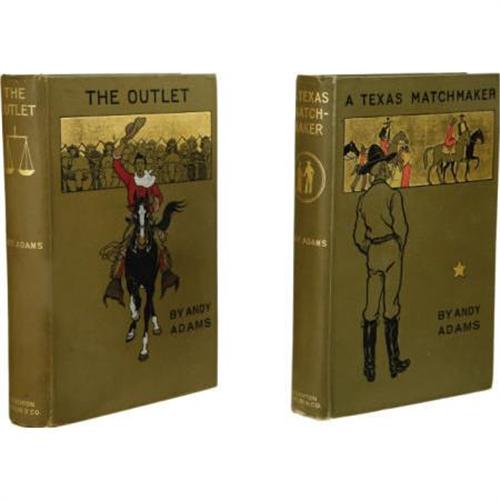 <B>Andy Adams: Wonderful Copies of Two Titles by Andy Adams, Both Inscribed: <I>A Texas Matchmaker</B></I></B></I> Illustrated by E. Boyd Smith. (Boston and New York: Houghton, Mifflin and Company, 1904). First edition, boldly inscribed by Adams on the title page. Octavo (7.5” x 4.75”). 355 pages. Illustrated with six full-page plates. Publisher's original pictorial green cloth, stamped in gold, black and yellow on the cover, and lettered and with a small circular vignette on the spine. Top edge stained green, others trimmed. Cloth with very minor rubbing, slightly over-opened at half-title, previous owner's bookplate on front pastedown endpaper. Together with: <B><I>The Outlet</B></I></B></I> Illustrated by E. Boyd Smith. (Boston and New York: Houghton, Mifflin and Company, 1905). First edition, inscribed by Adams on the title page to Donald A. Ritchie. 8vo (7.5” x 4.75”). 371, 4, publisher's catalog pages Illustrated with six full-page plates. Publisher's original pictorial green cloth, stamped in gold, black and white on the cover, and lettered and decorated in gilt on the spine. Top edge stained green, others trimmed. Cloth with very minor rubbing, a bit of foxing and browning, especially to the preliminary and terminal leaves and including the title page. Very attractive examples of these two inscribed books, housed together in a cloth slipcase with a leather spine lettering label.<BR><BR><b>Shipping:</b> Books & Catalogs (<a target="_blank" href="http://www.heritageauctions.com/common/shipping.php">view shipping information</a>)