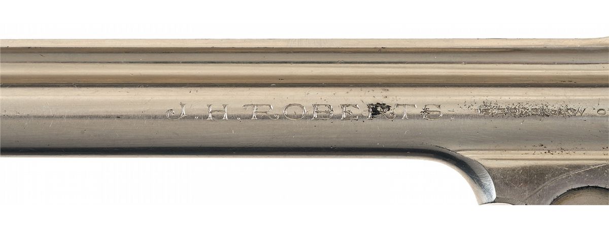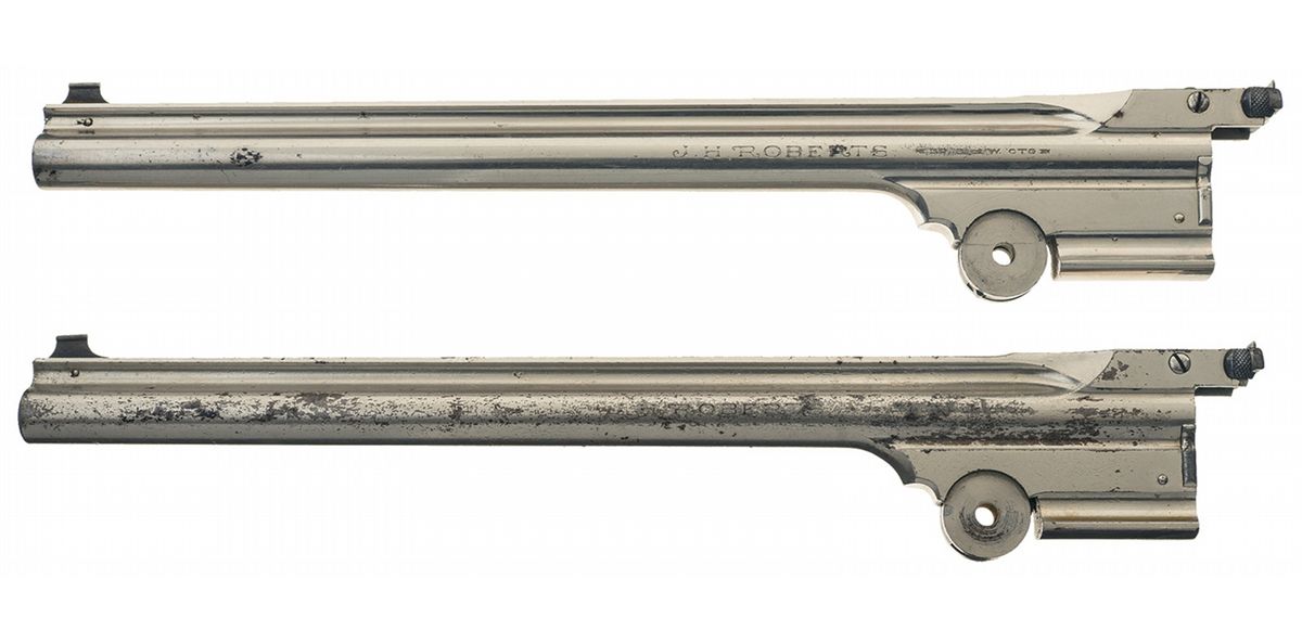 Both are 10 inches long, have Paine Target Blade front sights, have a windage adjustable rear sight and are engraved on the left side "J. H. ROBERTS". One is chambered for .22 LR serial number "3260" and the other is chambered for .32 S&W serial number "2660".
