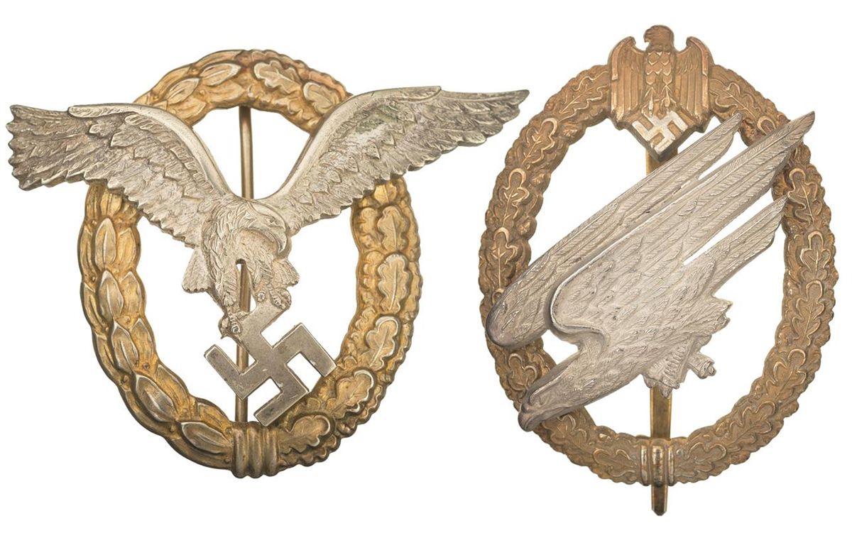 1) Pilot/Observer Badge, 2 3/8 inches wide with "B&N/L" on the back of the silver eagle and "GENERALLEUTNANT/KURT-MALZER" on the back of the gold wreath. Joining the Imperial Army in 1914, Maelzer earned the 2nd and 1st Class Iron Crosses as well as receiving training as a pilot. Retraining as an artillerist and engineer following the war he joined up with the infant Luftwaffe in 1934, serving as a technical school instructor, commander of Bomber Wing 255, and later as military Commandant of German-Occupied Rome. Following his capture at the end of the war, he went on trial for his actions as Commandant, specifically mistreatment of Allied prisoners of war and the Ardeatine Massacre, the retaliatory killing of civilians, prisoners and jews in response to a bombing by Italian Partisans. 2) Heer Paratrooper Badge, 1 5/8 inches wide and 2 1/8 inches tall, with "800" on the back of the eagle and "Fallschirm-InF-Btl./Leutnant Leithold" on the back of the wreath. Lt. Leithold has not been identified.