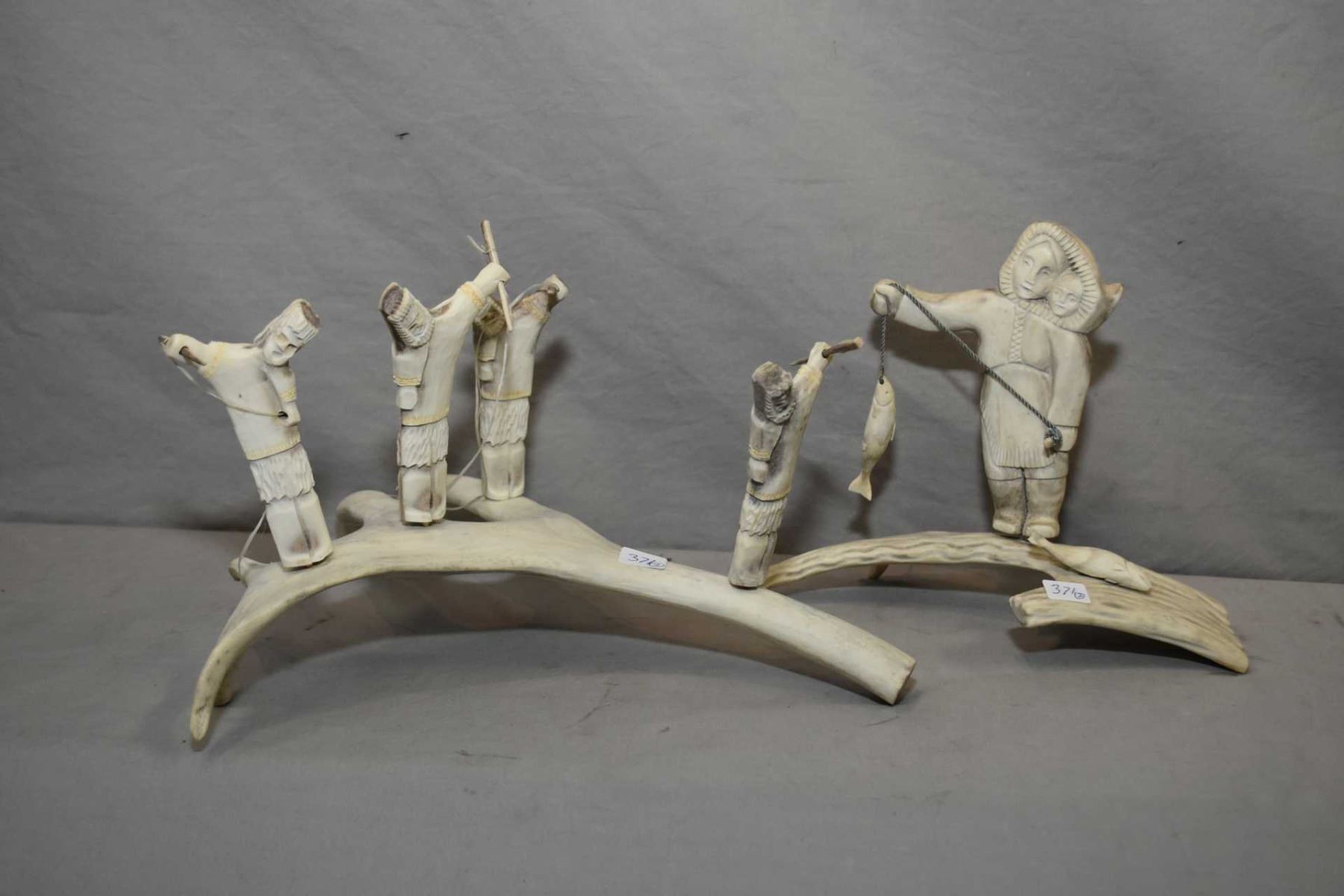 Two Inuit antler carvings including a four person spear hunting team 11" across and a mother and child fishing 9" across