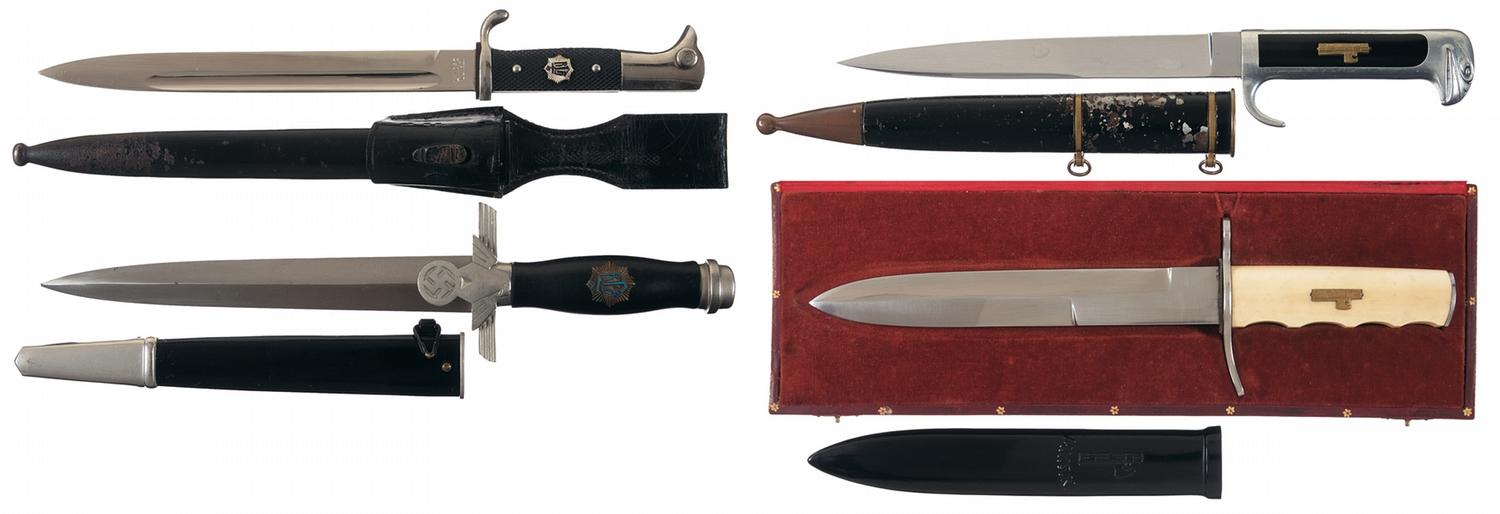 1) Nazi bayonet with RLB grip badge, 9 3/4" blade with Horstator (Solingen) and Worz (Ulm) markings on the ricasso, nickel hilt fittings, and nickel and blue enamel RLB badge on the grip. With a metal sheath and leather frog. 2) Reichs Luftschutz Bund (RLB) leaders dagger, 9" blade with Weyersberg (Solingen) makers mark, eagle themed cross guard, nickel pommel, smooth grip with "RLB" badge and black enamel/ nickel sheath. 3) Italian Fascist dagger, 7 3/4" blade, alloy pommel with black grips and brass fasces plaque. With a brass accented black enamel sheath. 4) Cased, ivory accented Italian Fascist dagger, 8 1/4" blade, unmarked, with polished fittings and ivory grip with brass fasces plaque. With a black enamel "M.V.S.N." marked sheath, red leather case, green/ white/ orange cockade ribbon and 4 Italian shoulder patches.