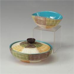 Two Italian ceramic pieces, a candleholder and a covered bowl, both with glossy turquoise interior, the exterior decorated with incised lattice on checkered matte ground. A few nicks. Ink marks/ Italy. bowl 7 1/2" dia. $100 - 150