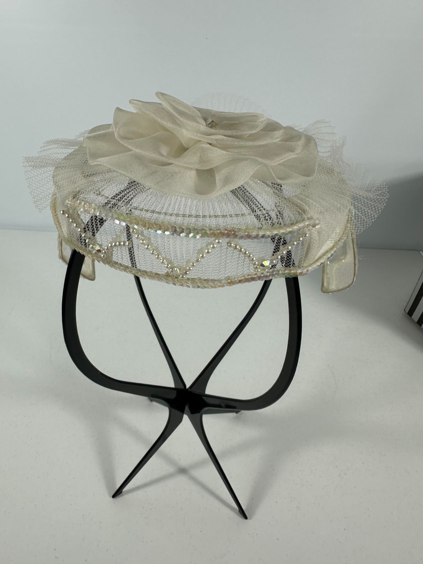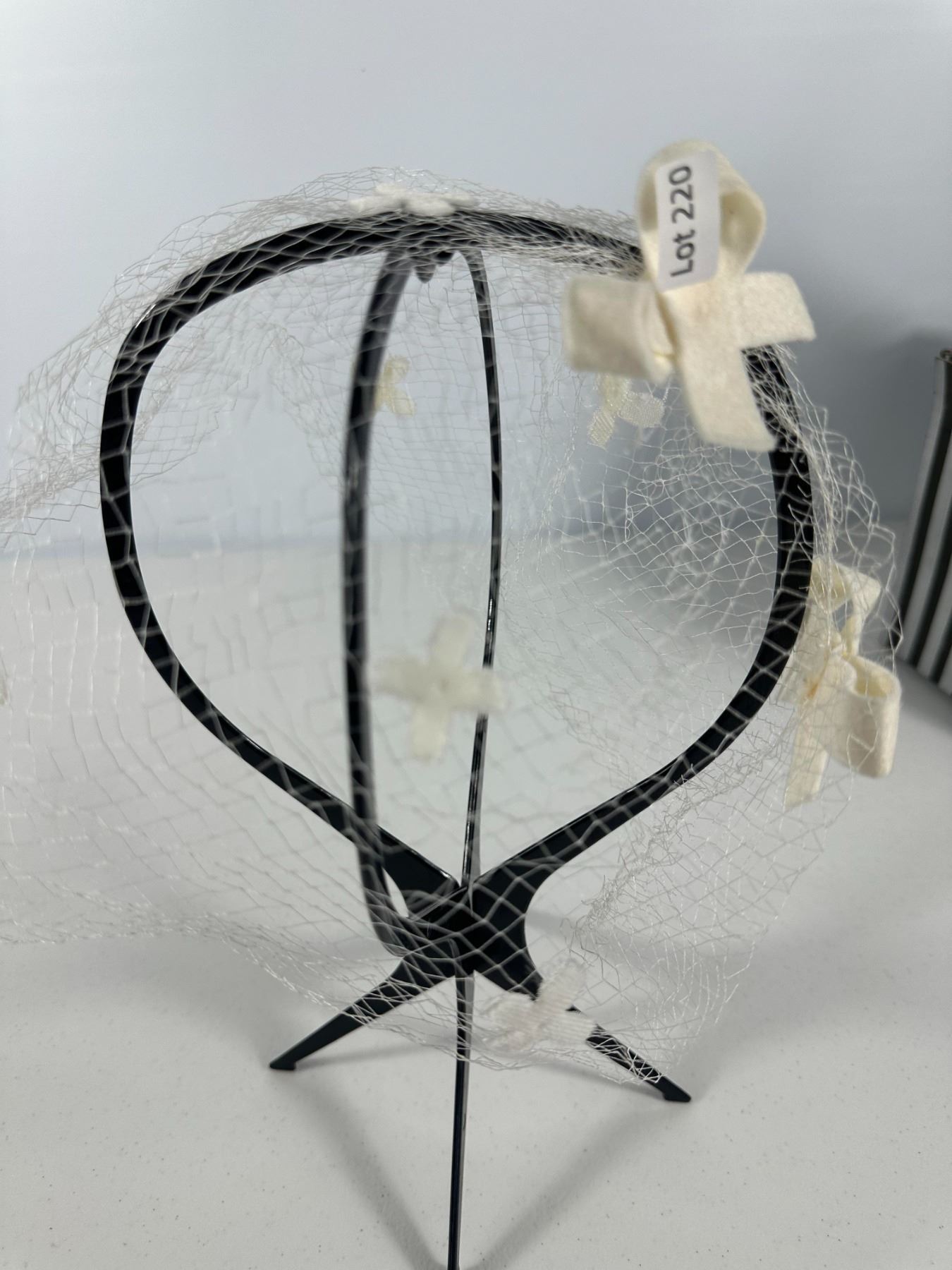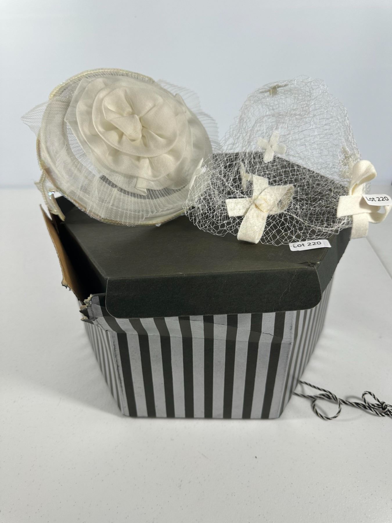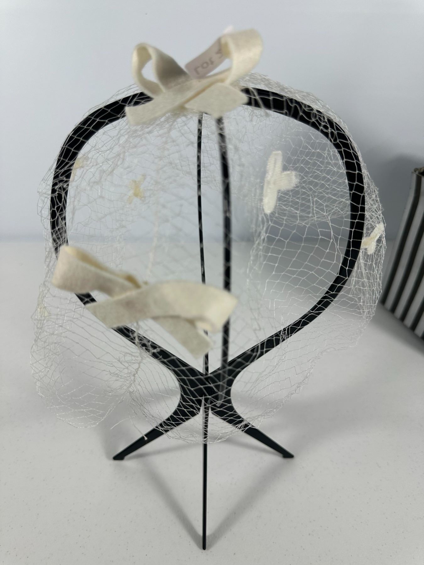Pair of 1950s/60s ivory headpieces: layered tulle rosette cap and open‑mesh birdcage veil with bows; supplied with a striped hat box (not original).