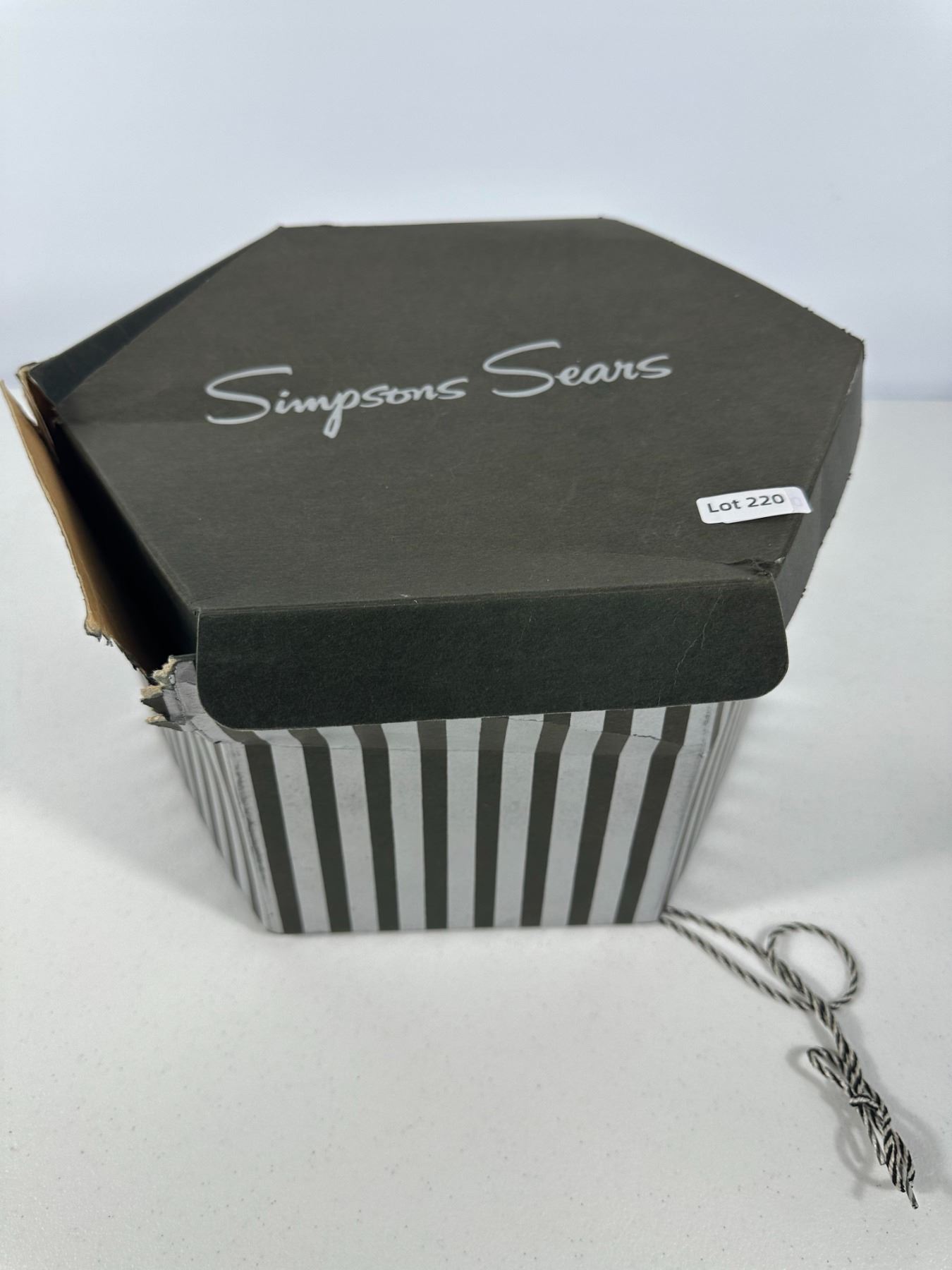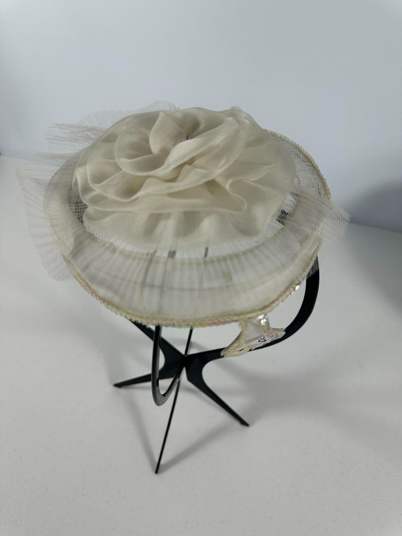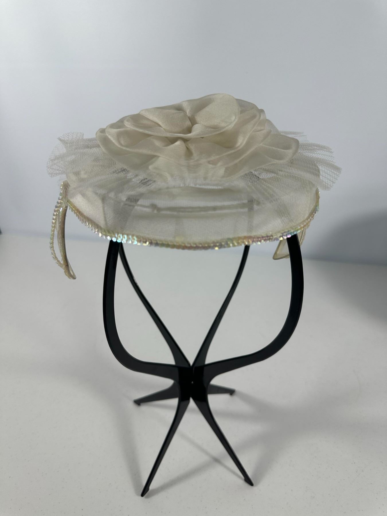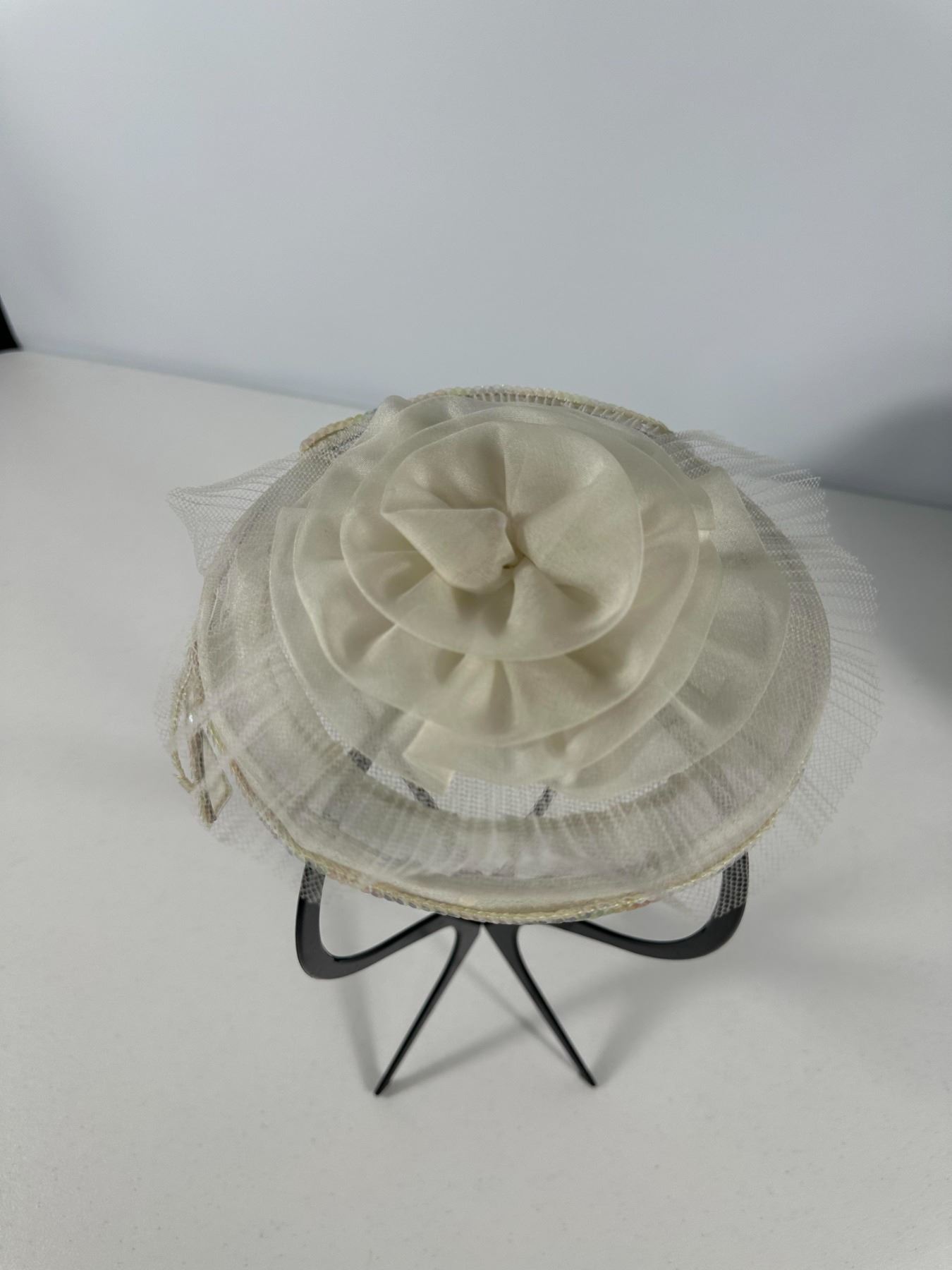Pair of 1950s/60s ivory headpieces: layered tulle rosette cap and open‑mesh birdcage veil with bows; supplied with a striped hat box (not original).