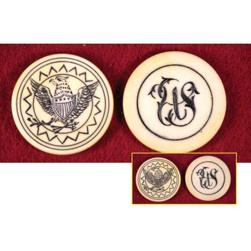 Two Ivory Poker Chips one eagle and one monogram. No chips or cracks, excellent condition.