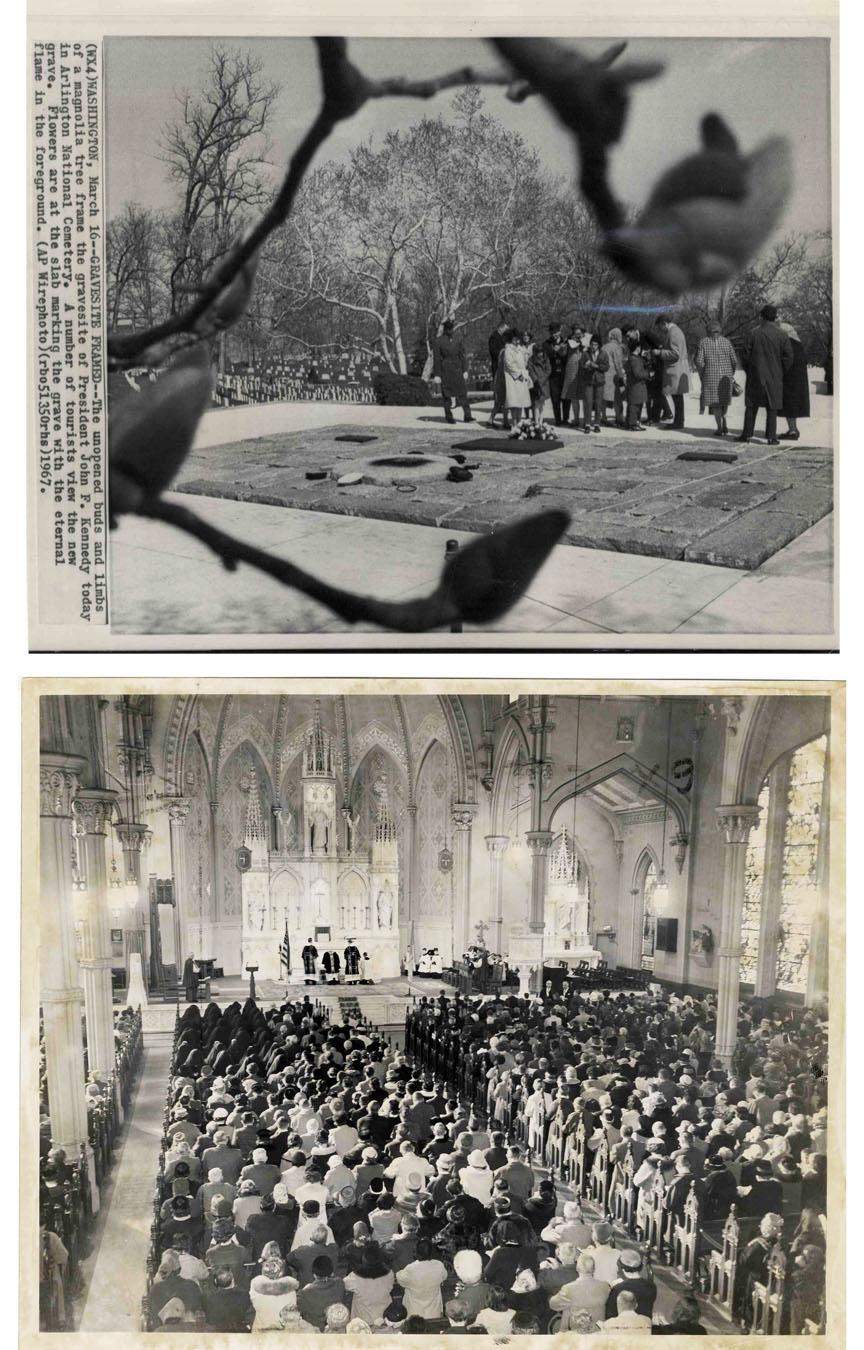 Two original press photographs of President John F. Kennedy's funeral and gravesite. Caption to black and white image of JFK's funeral service reads, βRev...John F. Gannon...sings a funeral Mass...at St. Paul's Cathedral...Gaz. Nov 25 1963.β Caption to gravesite photo reads in part: β...the gravesite of President John F. Kennedy...in Arlington National Cemetery...β From the Robert White collection. Excellent condition.