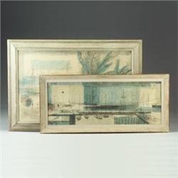 Two JOE JONES for ASSOCIATED AMERICAN ARTISTS landscape prints in shades of blue, beige and brown on white ground, mounted in pickled oak frames. AAA itendification under mount, signed. Each image: 18" x 33" and 21" x 34" $200 - 400