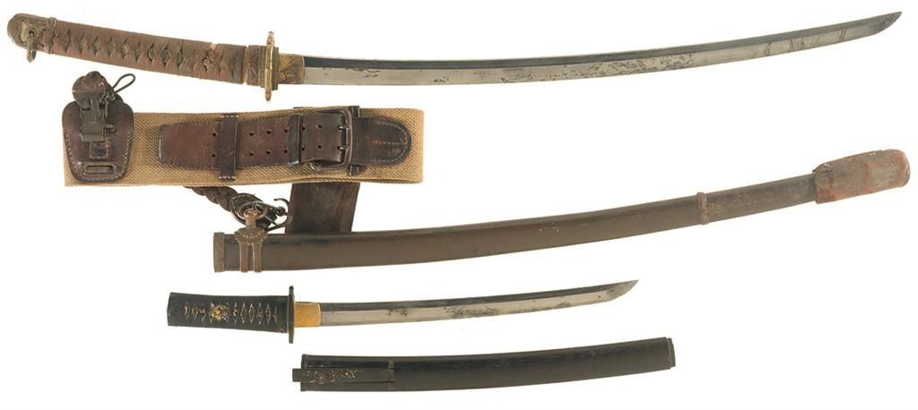 1) Shin-gunto pattern sword, 35" OAL, 24" blade, military hilt and scabbard, and a canvas/leather sword belt. Blade chipped and pitted, otherwise fair. 2) Japanese wakizashi-length blade, 18 3/4" OAL,12 3/4" blade with straight temper line, gold and semi-precious stone accented fittings, and a gilt lacquer accented saya with 3-symbol signature and a signed kogatana. Some lost components on saya, wear on blade, otherwise good.