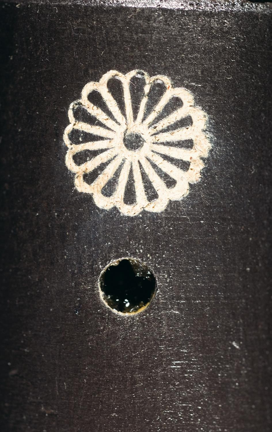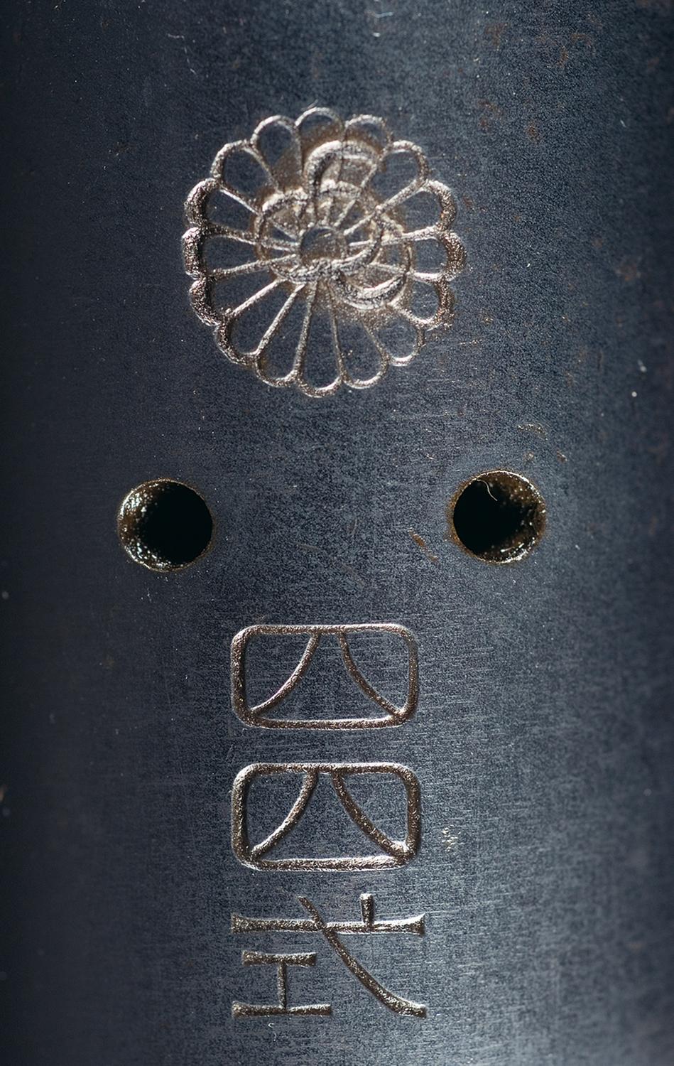 A) Designed in 1911. Blade front and short staff rear sights, with the mum stamped over with the 4 intertwined cannonballs of the Tokyo Arsenal, indicating rework for military schools. Equipped with a 13 1/2" triangular spike bayonet, with base numbered "532" and secured with two bolts. Smooth pistol grip stock with a grooved forearm, side mounted sling swivels and a flat butt with storage compartment.