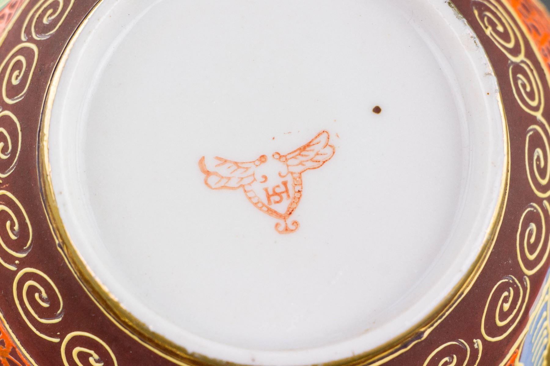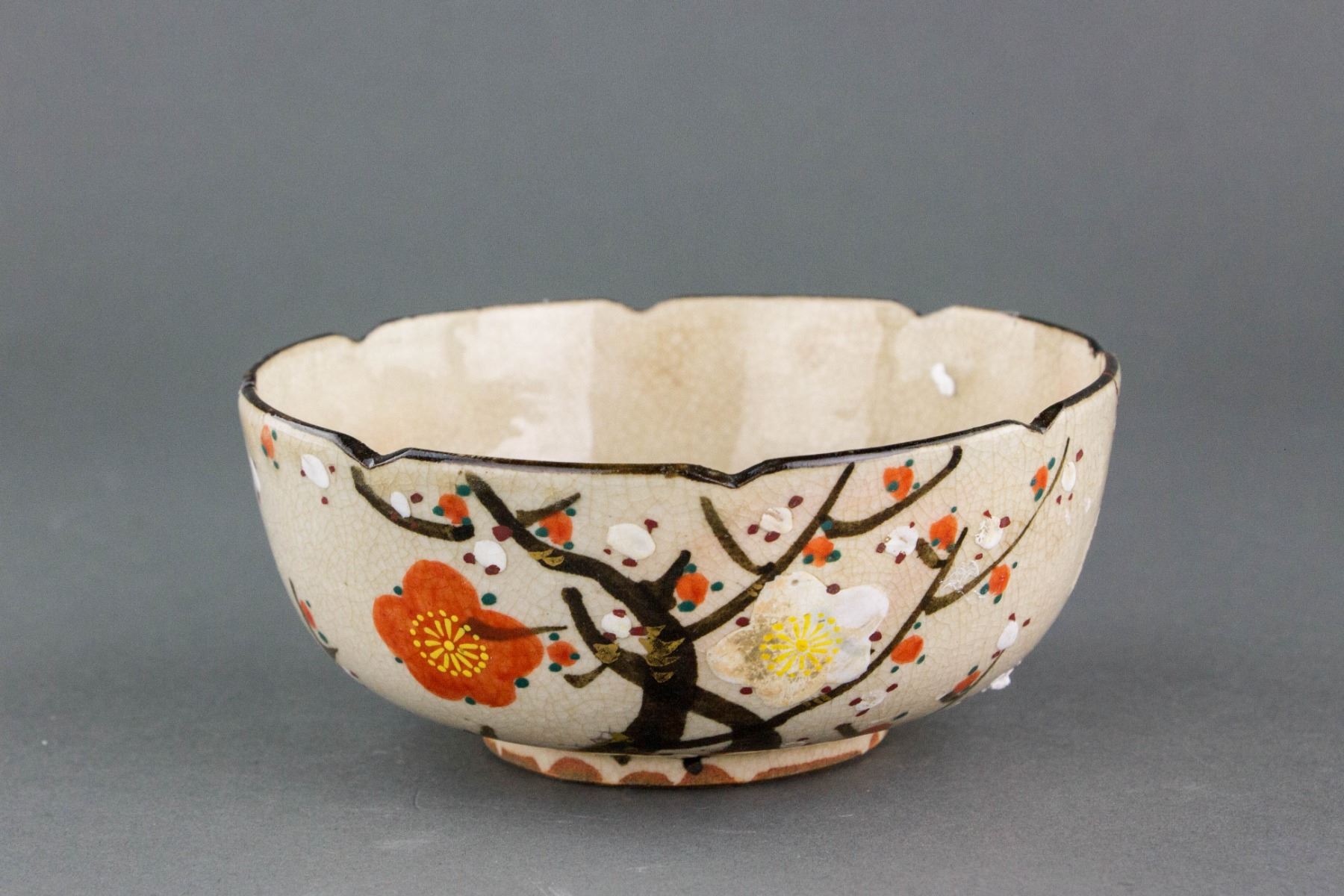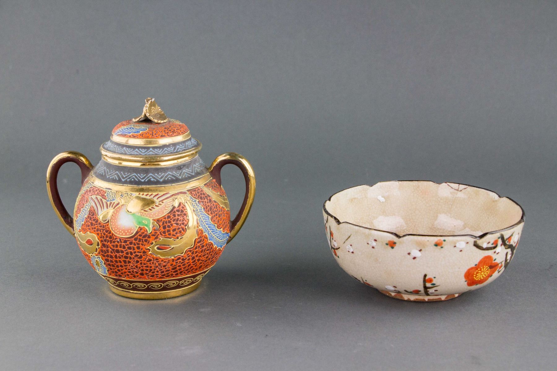 Two (2) pieces of Japanese gilt porcelain items; jar of globular body; flanked with two curved handles; with flower pedal form knobbed cover; painted with birds and flowers; maker's mark on base; bowl of foliated edge, tapering to bottom; supported on short foot rim; painted with sakura; 14 cm x 11 cm/12 cm x 5 cm, 240 grams/225 grams