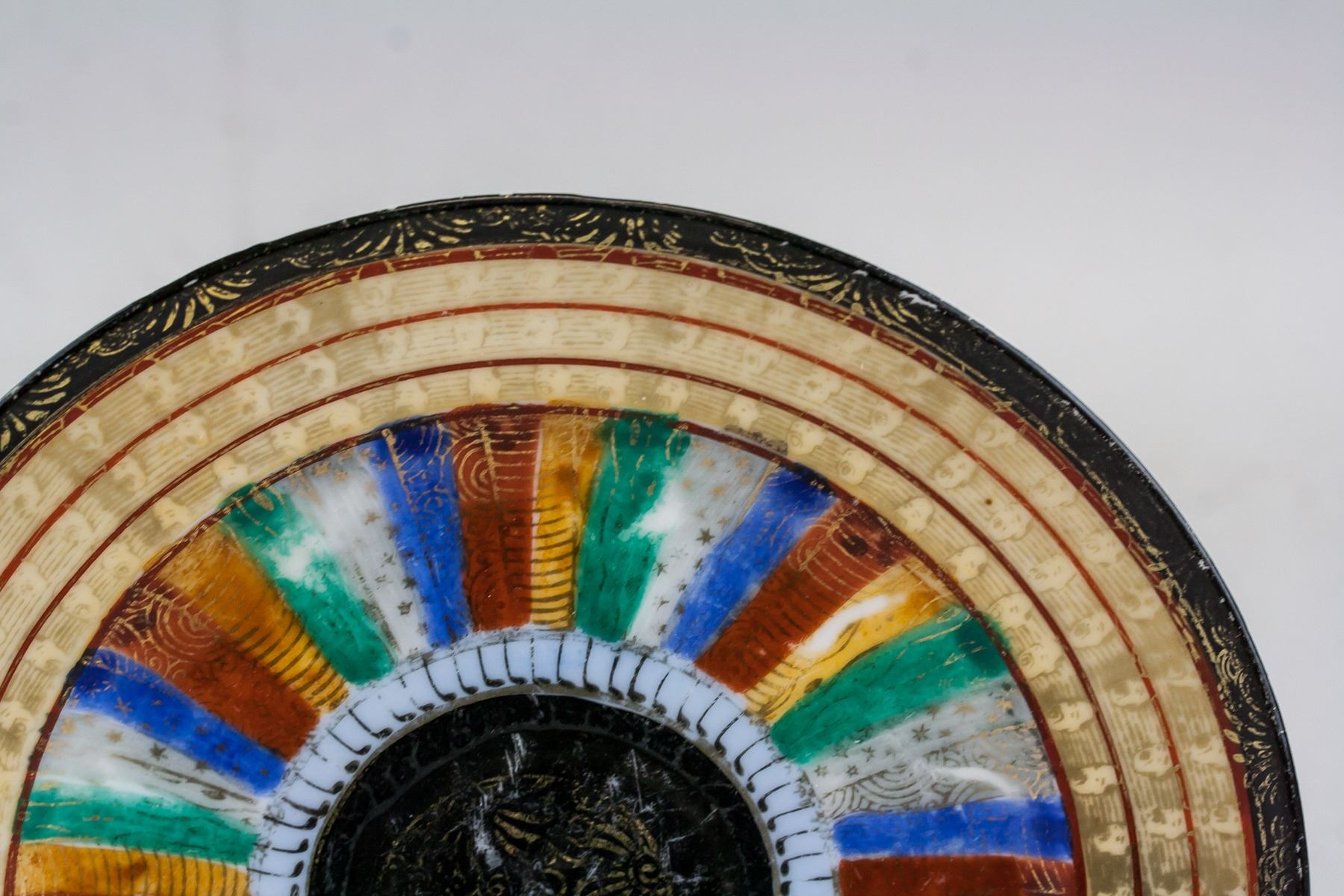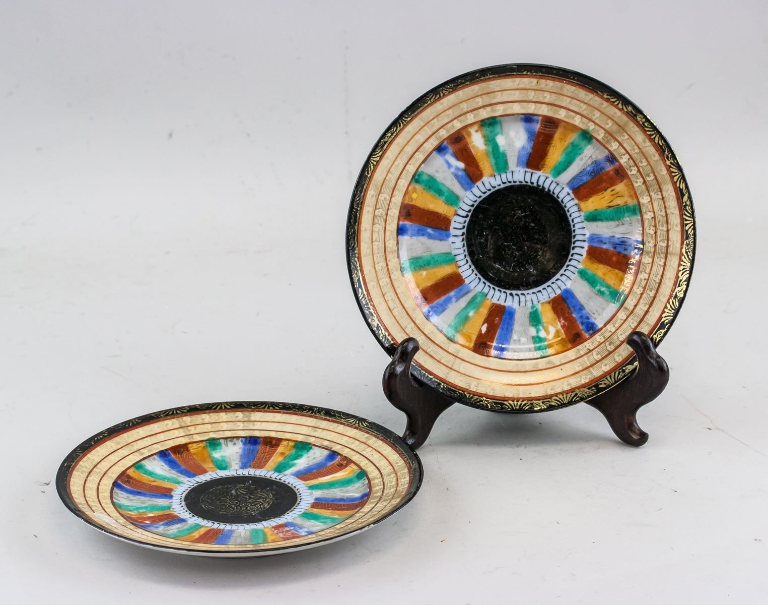 Two (2) Japanese gilt porcelain plates. Of round edge, tapering to bottom, supported on short foot rim. Painted with colorful strips. MADE IN JAPAN and HAND PAINT marks on base. 2.5 x 18 cm, 489 grams (total)