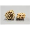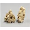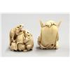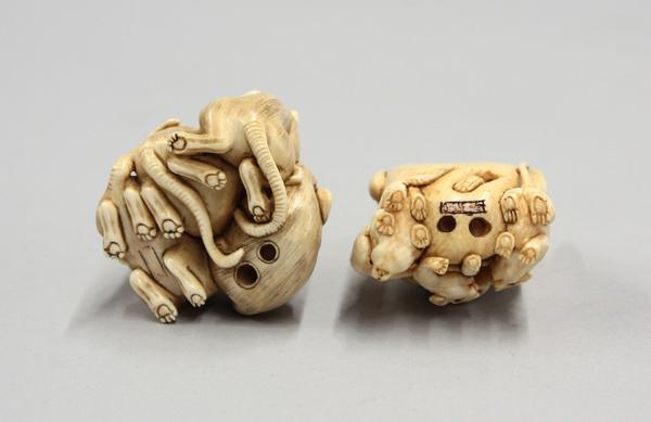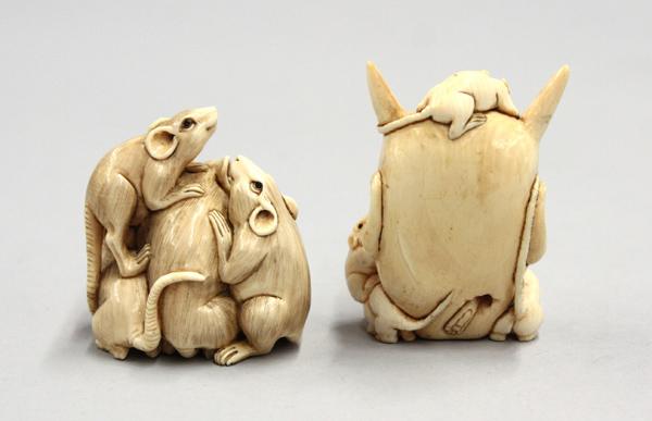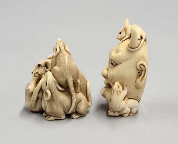 (Lot of 2) Japanese ivory figural netsuke, the first realistically carved as a group of five frolicking rats, each with inlaid eyes and incised details with pigment accents, 1.75''h; the second also featuring five mice, but now climbing on and around the mask of a demon with short horns, inlaid eyes, signed [illegible], 1.75''h