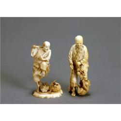 Two Japanese Ivory Okimono of a Snake Charmer and a Man with a Monkey, Meiji Period (1868-1912)...