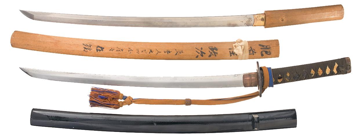 Condition: 1) Very good. A patch of brown spotting is visible on the left side of the blade just above the habaki, along with some light handling marks. Saya is clearly visible. A crack is forming in the habaki. Consignor notes state that the tang is shortened. Fittings are very good, with some mild dents and scratches. 2) Good, with dents, spotting, sharpening marks and signs of handling on the blade. Tsuba shows light wear and is slightly ill-fitting, and minor dents are present on the saya.