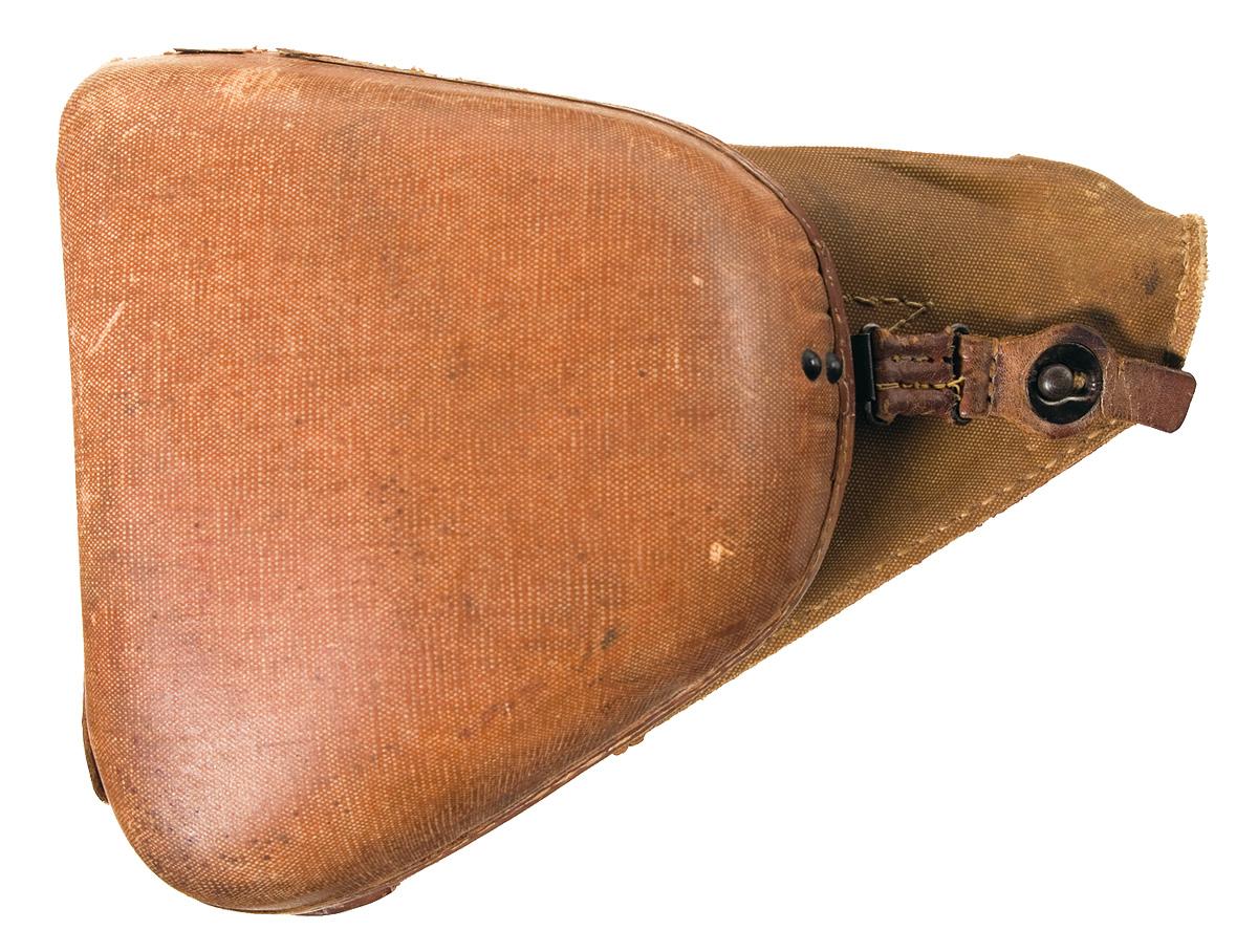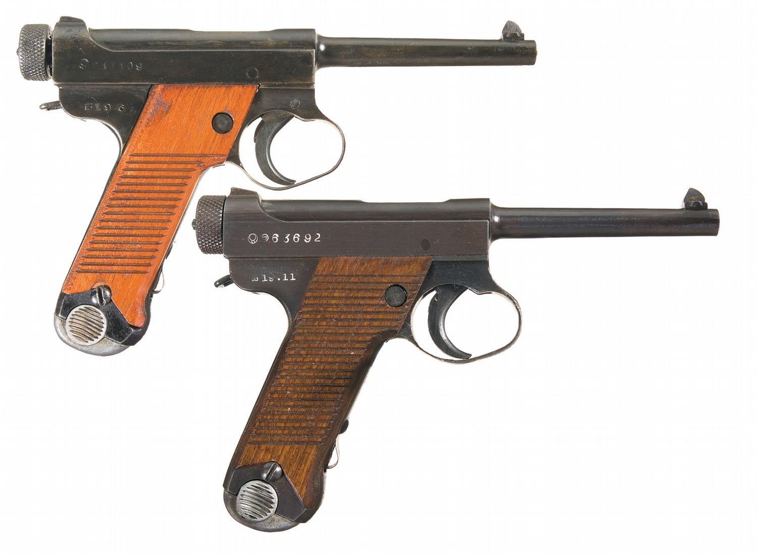Manufactured in November 1944 (19.11) at the Nagoya Army Arsenal-Toriimatsu Factory. Blued small parts, large trigger guard, checkered cocking knob, and external spring on the front strap. Fitted with ribbed grips. Complete with two magazines numbered to the gun (692) and clam shell holster.