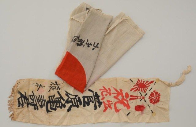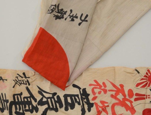 Two Japanese WW II flags; one standard “meat ball” type with inscription, approx. 34” x 29”, silk with leather tabs; one a pendant or banner with crests and inscriptions, approx. 8-1/2” x 30”; fair to good condition; sometears and mothing. Est.: $150-$300.
