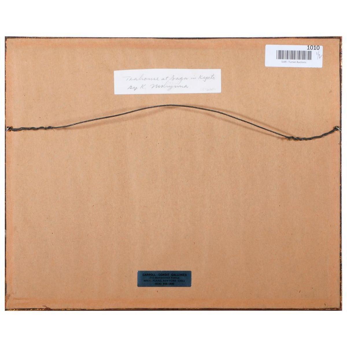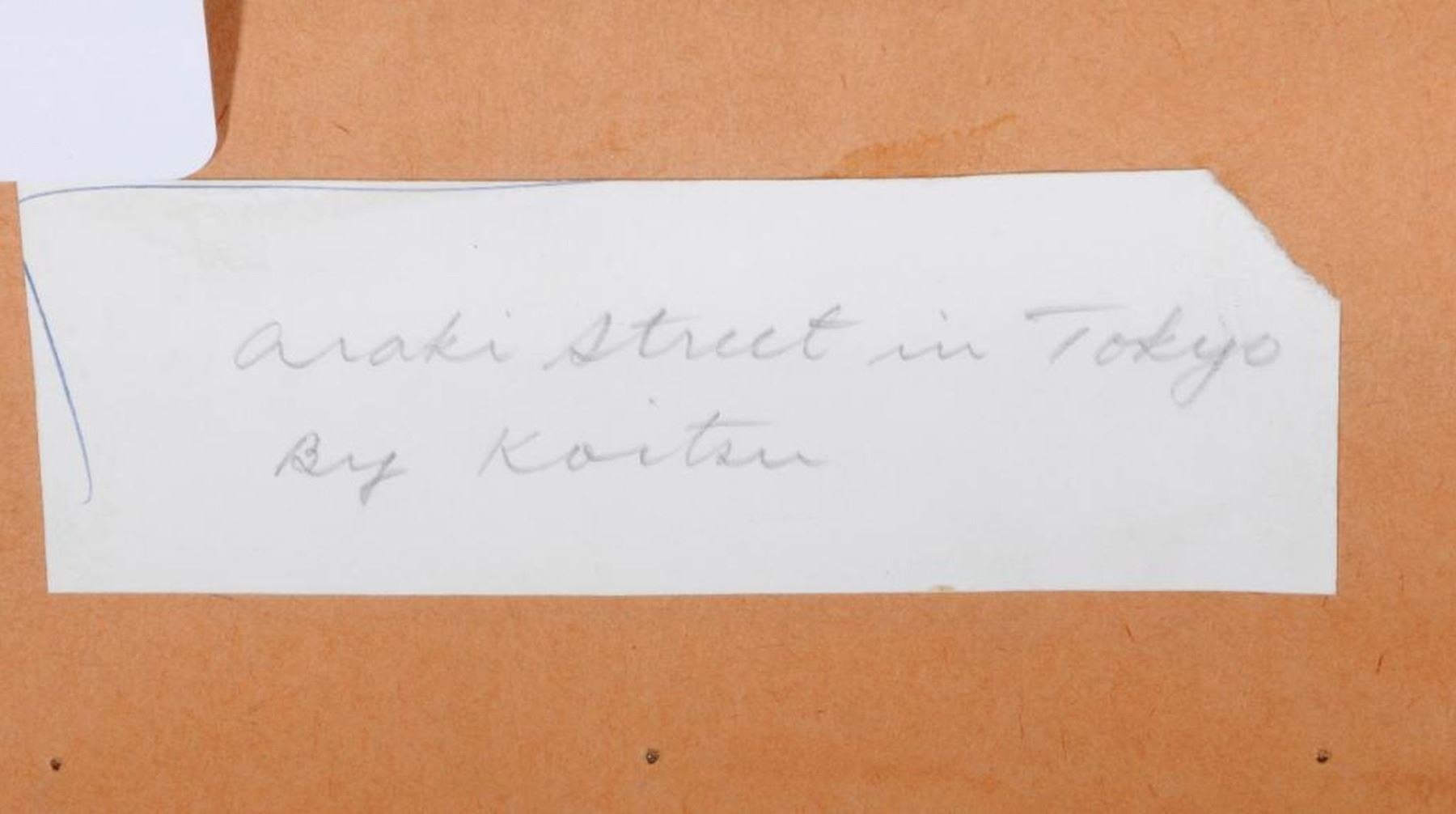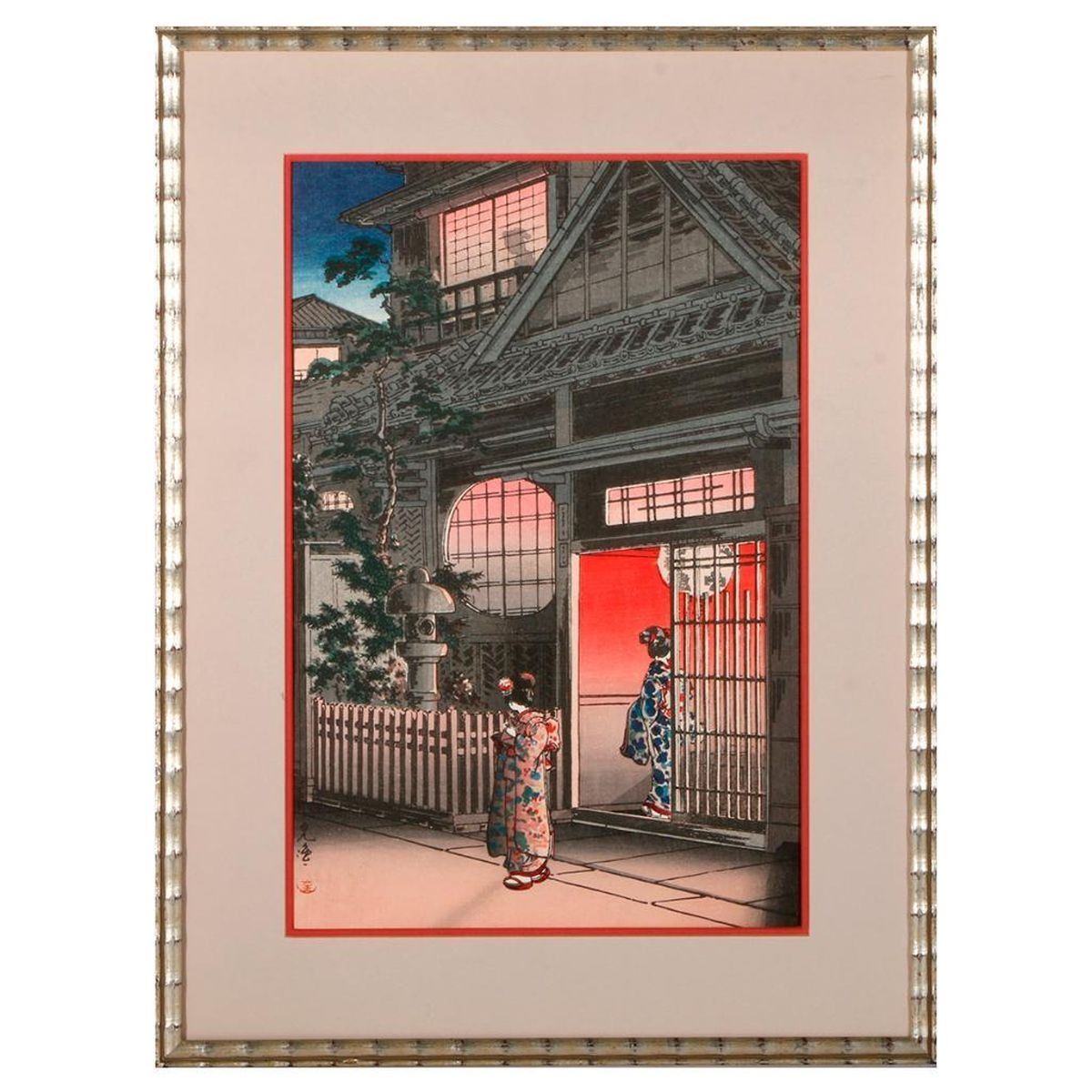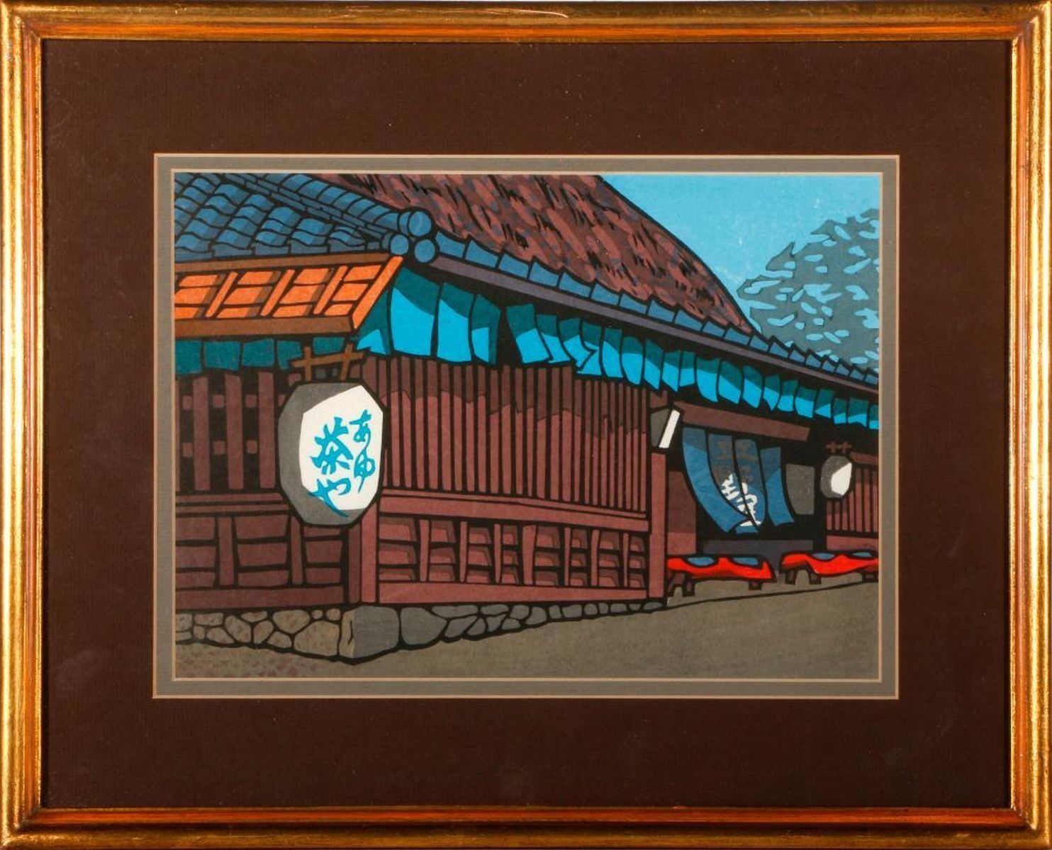 Artist: Reverse labeled possibly K. Nishimura. Reverse labeled Koitsu (Yamamoto Koitsu 1843 - 1905). Subject/Title: Tea house at Saga in Kyoto. Aroki Street in Tokyo. Medium: Woodblock print. Size Artwork: 7 1/2 inches high x 10 1/2. 14 inches high x 9 1/4. Size Frame: 12 3/4 inches high x 16 1/2. 19 inches high x 14 1/4. Condition: Good.