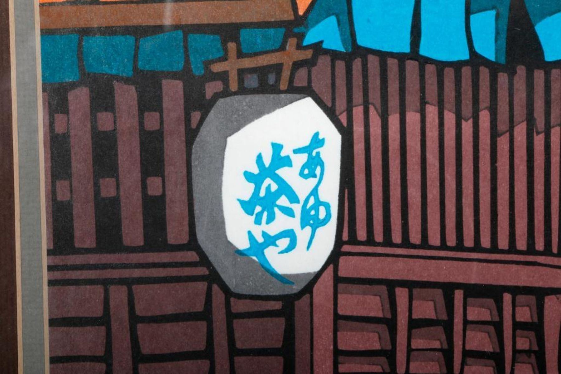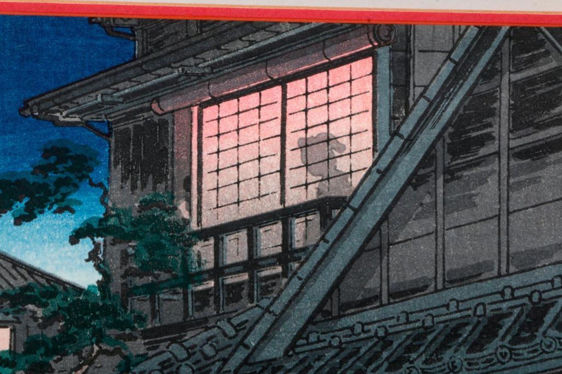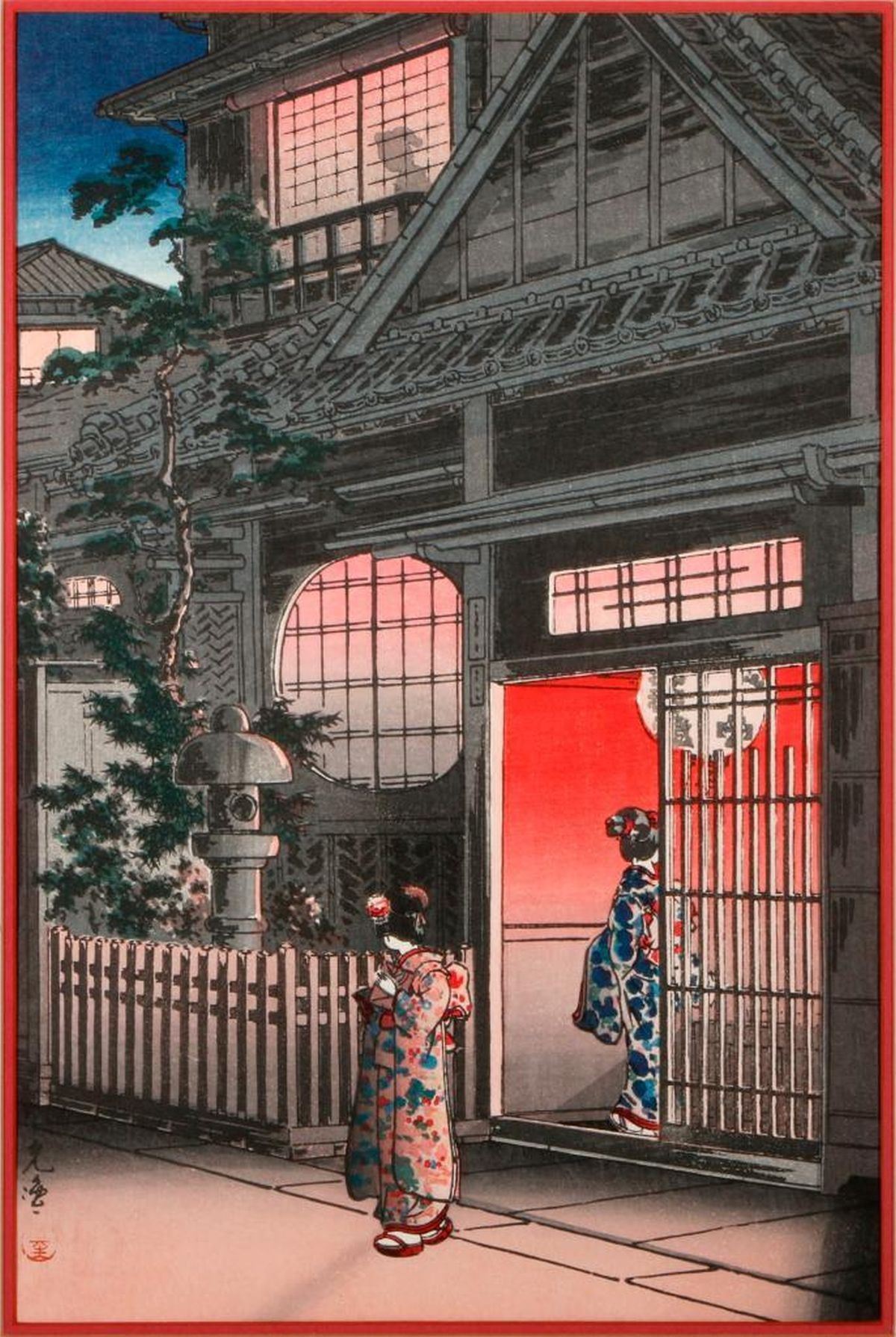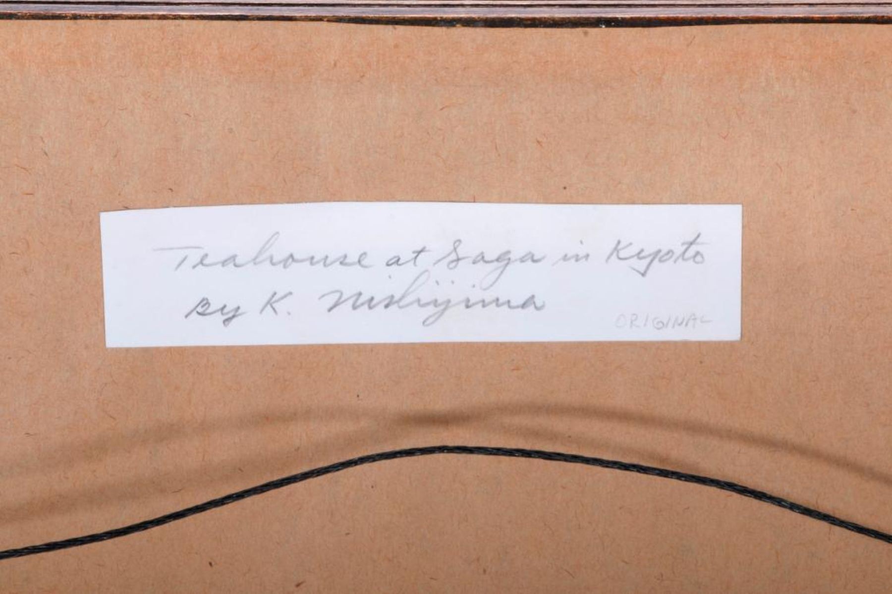 Artist: Reverse labeled possibly K. Nishimura. Reverse labeled Koitsu (Yamamoto Koitsu 1843 - 1905). Subject/Title: Tea house at Saga in Kyoto. Aroki Street in Tokyo. Medium: Woodblock print. Size Artwork: 7 1/2 inches high x 10 1/2. 14 inches high x 9 1/4. Size Frame: 12 3/4 inches high x 16 1/2. 19 inches high x 14 1/4. Condition: Good.
