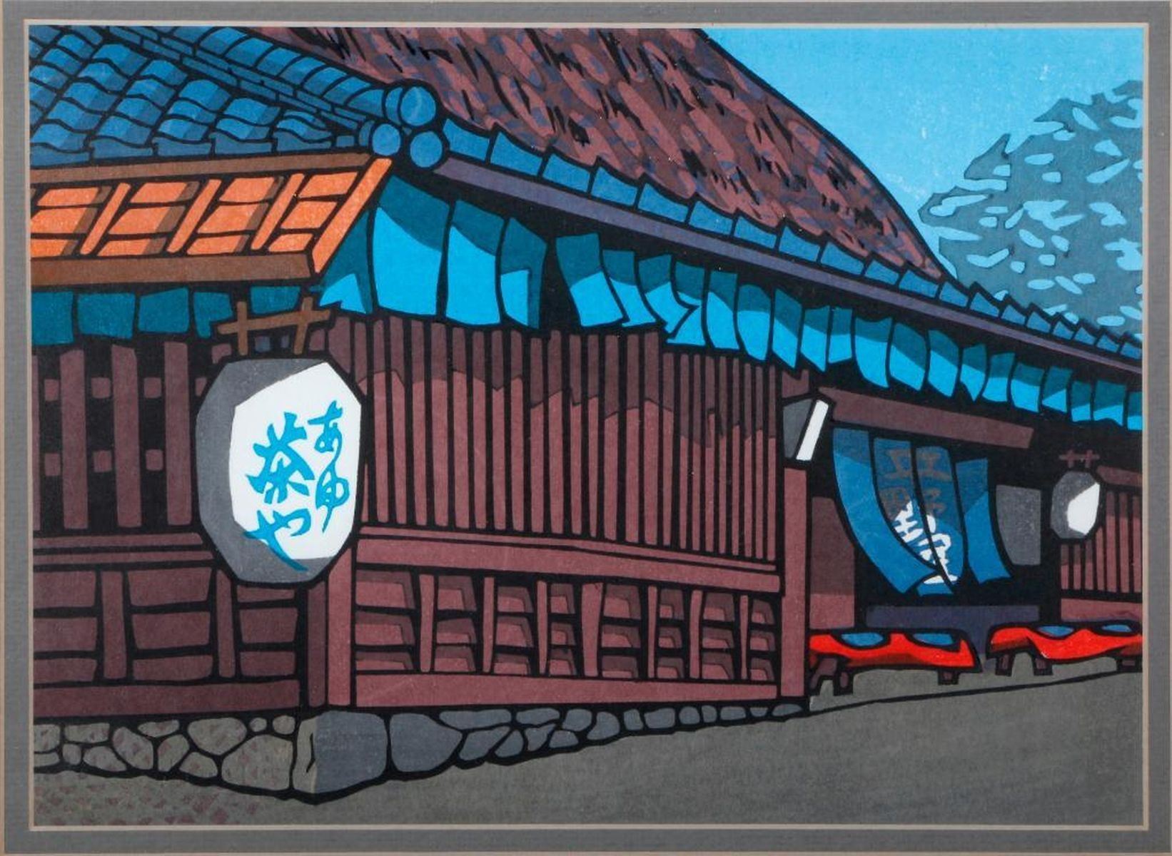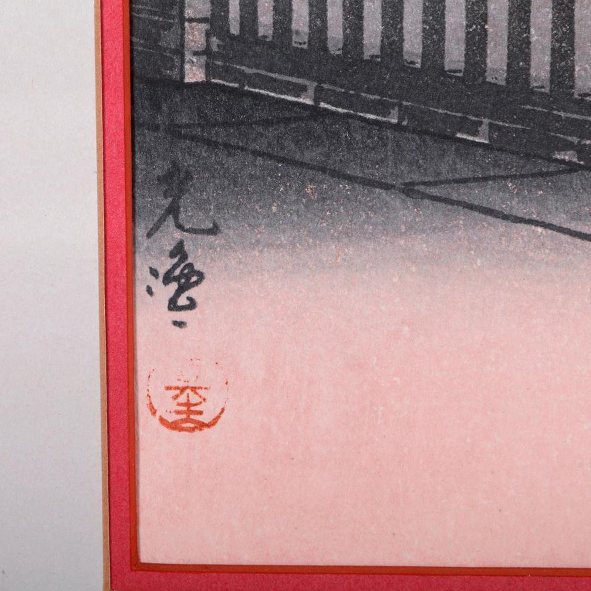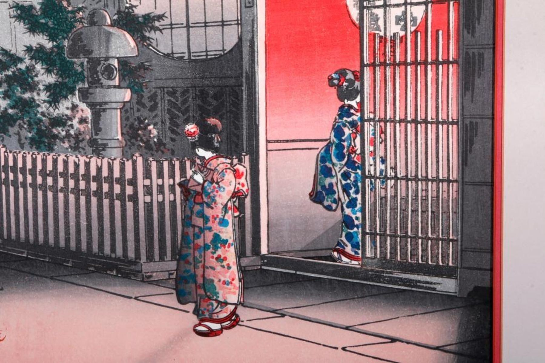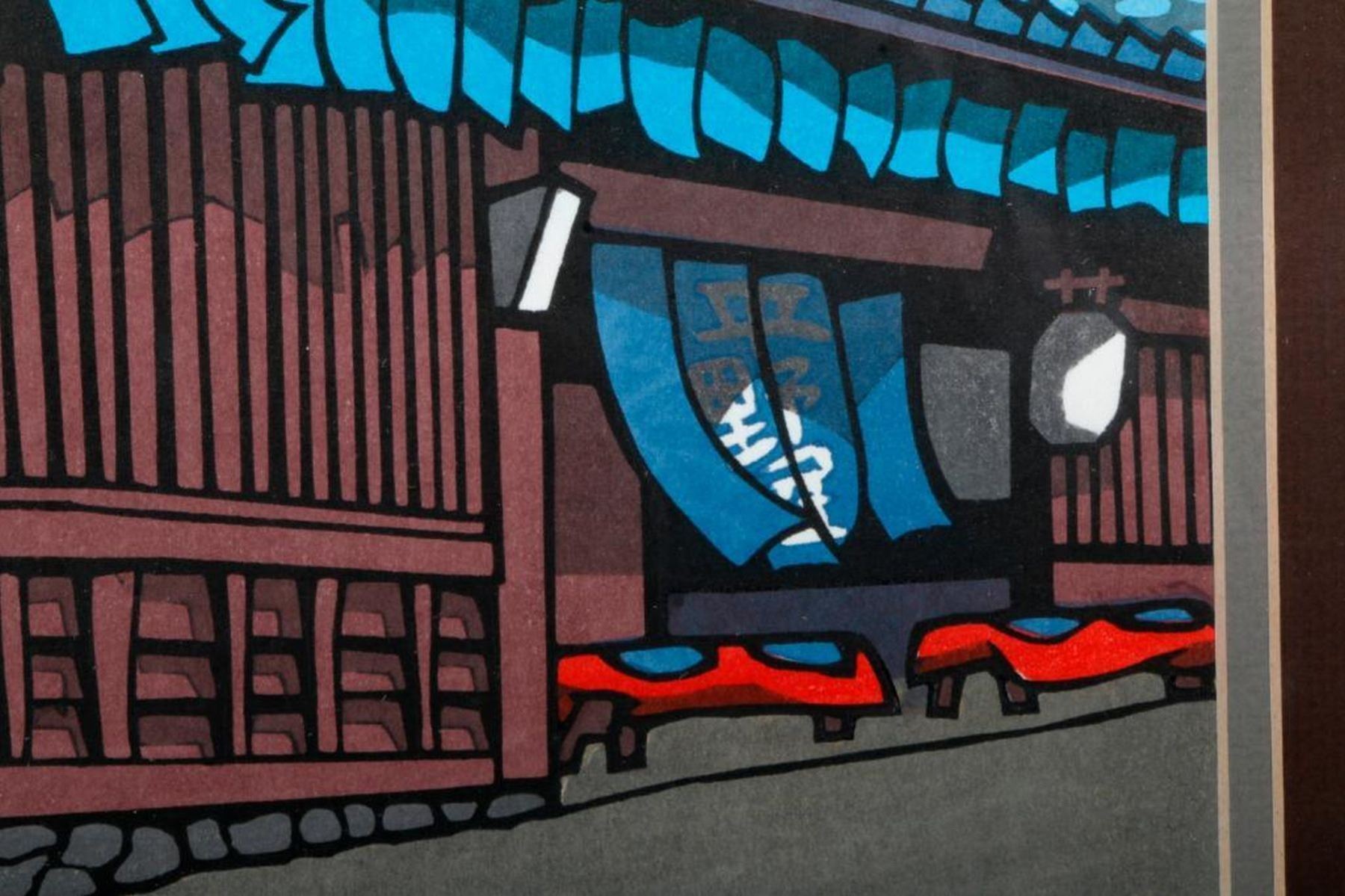 Artist: Reverse labeled possibly K. Nishimura. Reverse labeled Koitsu (Yamamoto Koitsu 1843 - 1905). Subject/Title: Tea house at Saga in Kyoto. Aroki Street in Tokyo. Medium: Woodblock print. Size Artwork: 7 1/2 inches high x 10 1/2. 14 inches high x 9 1/4. Size Frame: 12 3/4 inches high x 16 1/2. 19 inches high x 14 1/4. Condition: Good.