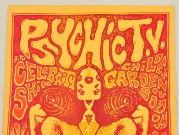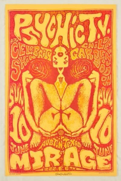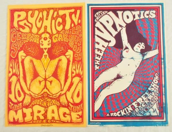 Thee Hypnotics, The Backroom, Austin, TX. March 27, 1992. Artist: Jason Austin. 11" x 17". Psychic TV Signed Poster, The Mirage, Austin, TX. June 10, 1990. Artist: Jason Austin, Famous Austin punk artist. 11" x 17"