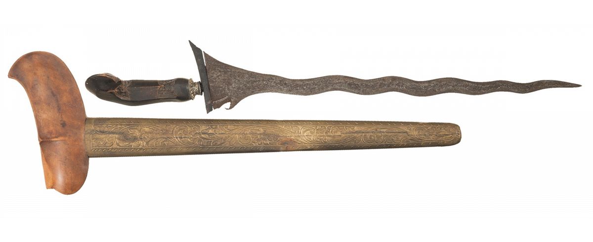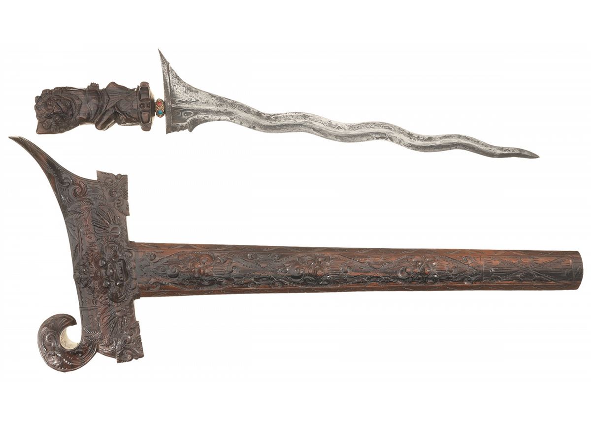 1) Measuring 19 3/4 inches overall, with a 14 1/2 inch meteor Damascus blade, with 9 bends and an asymmetric base, and a stone accented golden collar between the blade and the grip, which is carved in the form of a man with a lion head, perched on a stool, with an obsidian knife concealed behind his head. With a superbly carved hardwood sheath, matching the grip in tone and grain, with raised carved monstrous heads, scrollwork, checkerboarding and floral patterns. 2) 18th Century Kris measuring 18 1/2 inches overall, with a 14 inch Damascus blade, with 11 bends and a proper two-piece asymmetric base. Hardwood grip, with carved grotesque head designs and a metal collar. The grip is mounted to run perpendicular to the blade, as opposed to the more typical parallel alignment; this may have been to facilitate an "modified saber" style grip. Hardwood and brass scabbard, with a "boat" profile throat and impressed floral designs on the outer face of the brass. Provenance: The William Ashby Collection
