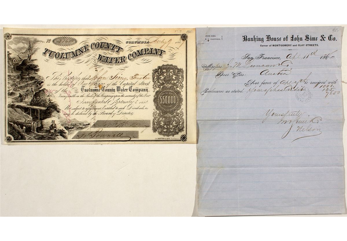 John Sime arrived in San Francisco very early. He was a carpenter/builder. However, he is most known as a San Francisco banker, but also a driving force behind the first West Coast powder factory, California Powder Works. the San Loranzo Paper Mill in Santa Cruz, and was a San Francisco merchant. Here we have two documents. 1) Tuolumne County Water Company stock certificate number 3165 for one share to John SIme, trustee, It is signed by J. Pownall and (?). The company was incorporated in 1852. Vignette of mines becoming rich form the water derived from this water company. The Tuolumne County Water Company was set up as an employee owned and controlled company. Founders went to surrounding areas raising expectations and investors. At the end of June, 1951, 160 shares of stock had been sold, the route had been surveyed, and workers were celebrating. Their efforts to tap into first Five Mile creek, then the south fork of the Stanislaus River were largely unsuccessful. After almost a year water finally arrived, but there was not enough to sustain full mining operations, and the company was forced to borrow money for capital investments. The Tuolumne County Water Company incorporated in September, 1852, with a new issuance of shares initially valued at $275. While the company was still trying to provide a good and plentiful supply of water, the miners were already protesting the high prices and low volume of water. 2) A letterhead from the Banking House of John Sime & Co. It is to John Duncan, an early and important Austin, Nevada merchant. (Prag collection.