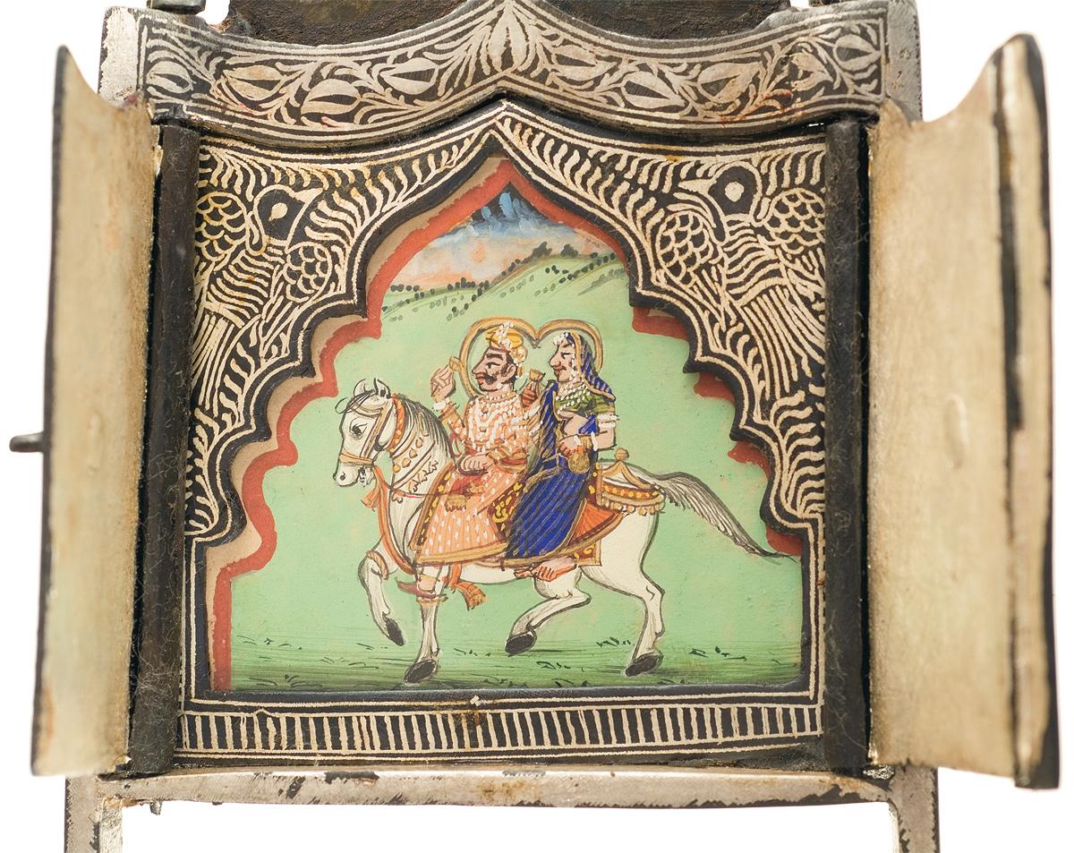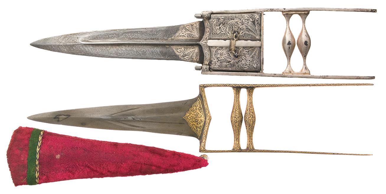 1) Silver Inlaid Katar Dagger, with 9 1/2" long, 2 1/4" wide reinforced Damascus blade with silver floral patterns near the hilt. Silver finished hilt with a 3 1/4" long midsection, 5 7/8" support bars and 3 1/4" wide grip bars with flared centers. The midsection is fitted with a pair of doors on each side, one opening to reveal a polychrome scene of a man and woman on horseback, framed with silver bird decorated steel, and the reverse opening to reveal the couple in private, with very little left to the imagination (NOT PICTURED). 2) Gold Inlaid Katar, single piece construction with 8" long, 1 3/4" wide and 1/4" thick near the tip, with 4 shallow fullers on each side and a gold floral panel on each side near the hilt. Fitted with 8" support bars and 2 3/4" grip bars, both showing gold scroll and floral inlay. With a red and green upholstered sheath, showing gold and brown cord on the seam.