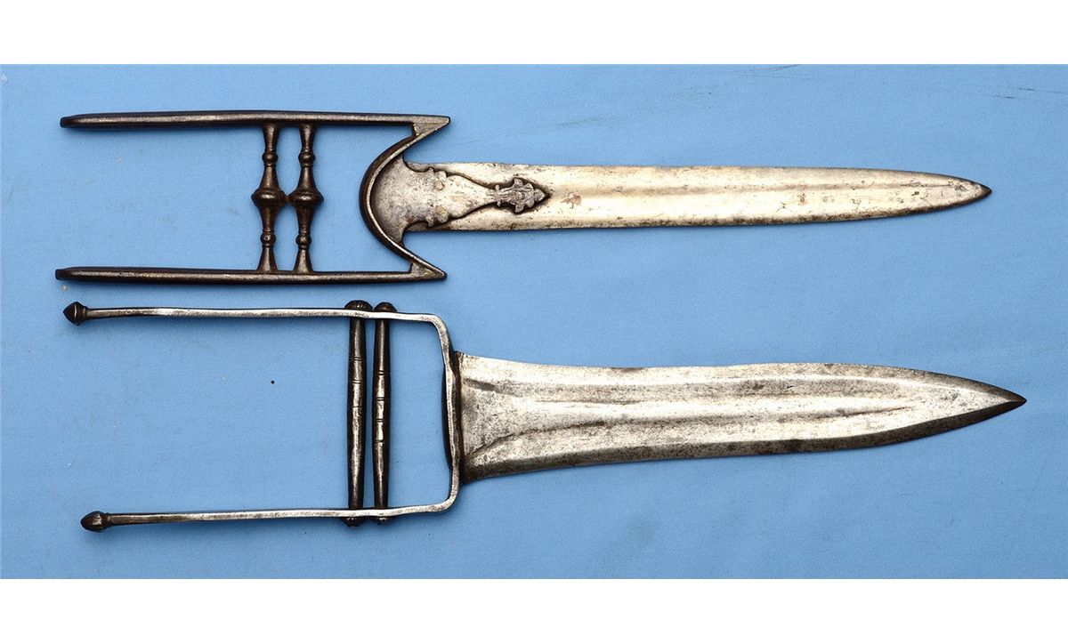 1) 17 3/4 inches overall with a 11 inch blade. 2) Katar, 18 inches overall with a 10 3/4 inch blade. CONDITION: 1) Good. 2) Fine.
