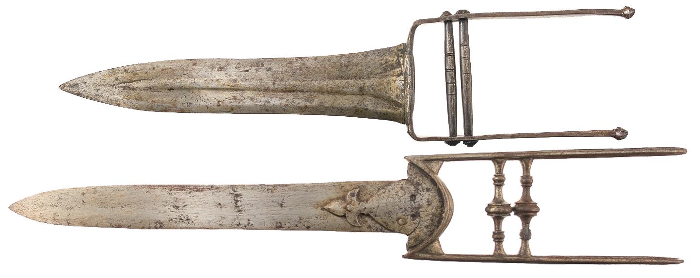 1) Katar, 10 3/4" long and 2 1/2" wide blade, with shallow fullers. Grip is fitted with 7" long support bars and a pair of 3 3/5" wide grip bars. 2) Katar, 11" long and 1 1/2" wide blade, riveted to a pair of Fleur-de-Lis style grip extensions. Grip is fitted with with 8" support arms 2 3/5" wide grip bars with expanded centers. Both appear very old and of European origin.