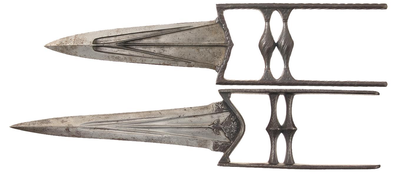 1) Katar, 7 1/4" long blade, 2/5" thick near the tip, with a set of 3 reinforced ribs on each side. Twist pattern grip, with 7 long support bars and 2 3/4" wide grip bars with flared centers. 2) Katar, 9 1/2" blade, 1/3" thick, reinforced similar to 1, with floral engraving at the bottom. Zig-zag etched grip, with 6 3/4" concave support arms and 2 7/8" wide grip bars. Both appear to be very old and European origin.