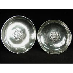 Two Keswick School plated dishes, each with a floral head motif in the centre, each marked 'Firth Staybrite', KSIA monogram, Keswick and both numbered B198/113and B310/115 respectively, 27.5cm and 24.5cm Est. 100/200