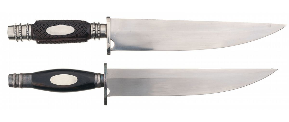 1) Unmarked, 9 1/2" blade and checkered hardwood handle. 2) Unmarked, 9 1/4" blade with micarta handle. Both very good plus.