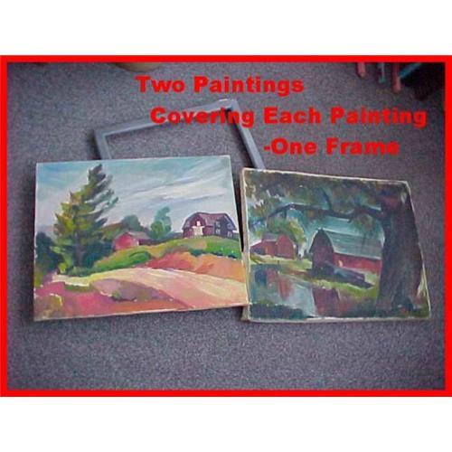 This listing consists of two 16" by 20" original landscape paintings on canvas. The barn painting covered the barn painting with the road in the foreground painting. A tight fitting wood frame holds both paintings together. The barn with a road painting has a wood stretcher frame. The name "L.D. Hagan, NY" is written on the wood stretcher frame. There is a listed artist name, Leslie Darrell Ragan(1897-1972)who studied at the Art Institute of Chicago and lived in California/Oregon. Is this the same artist? No guarantee. Exact age is unknown; probably 1940's era. Good condition on both paintings and some scuffing on painted frame.