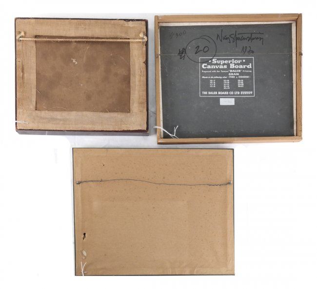 1) Vickers landscape painting on board signed "A. Vickers" in the lower left [Sight: 9" H x 12" W; Frame: 11" H x 13 3/4" W]. Light surface grime. 2) Trees with house landscape, oil on canvas. Illegibly signed in the lower left. [Sight: 7 3/4" H x 9 3/4" W; Frame: 9" H x 11" W]. Minor staining. 3) Abstract painting on canvas signed in Greek in the lower left. [Sight: 10 1/2" H x 12 1/2" W]. Light surface grime.
