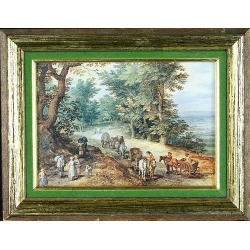 This is a charming print of different travelers converging upon the same area on the road. The print is in very good condition and shows in crisp clarity the many details that the original artist so meticulously rendered. This print is perfectly framed in a gold and black wood frame with green velvet inlay that compliments the picture perfectly. This print measures a total of 7.25? x 9 1/8? framed.